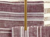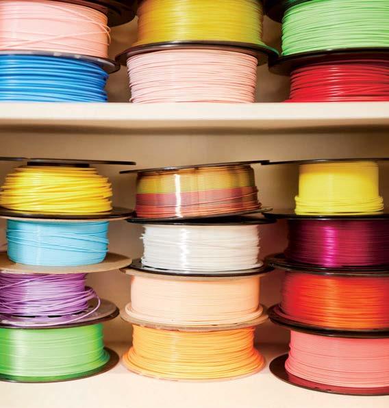In her Tank Studios workspace, artist Jodi Stuart (opposite) holds the 3D-printing pen she uses to create colorful, filament-based sculptural forms (left and bottom) which have a lightweight, woven quality. Rolls of the PLA material she uses are stacked on her studio shelf (below).