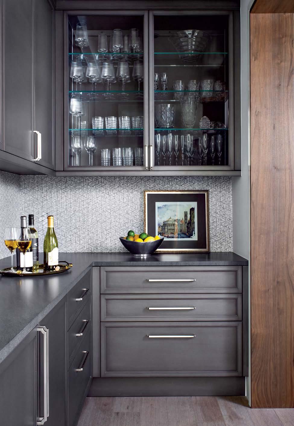 Right: A pass-through between the kitchen and dining room, the pantry features countertops of Black Cardosa granite—which also lines the kitchen’s perimeter counters—as well as Top Knobs hardware from Rio Grande Co. The walls showcase a print from York Wallcoverings.