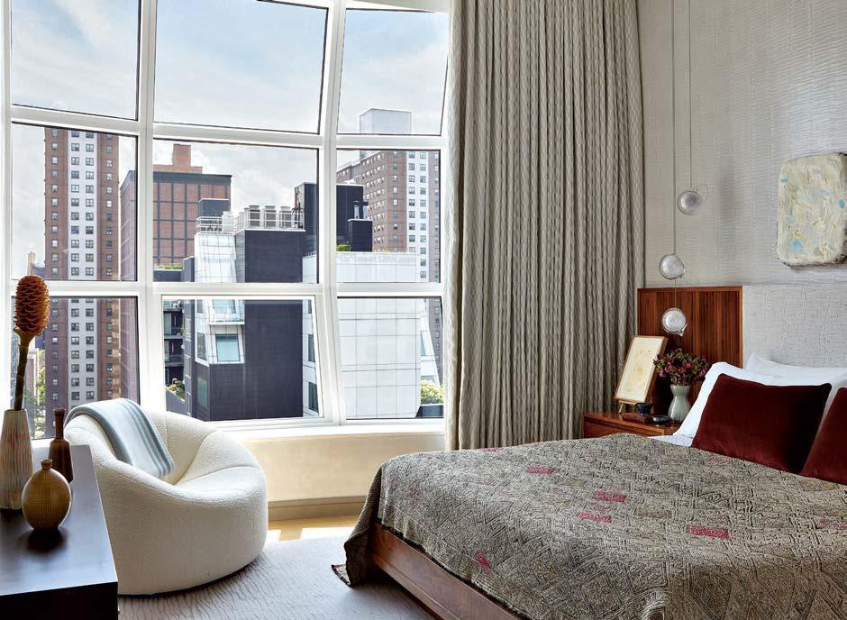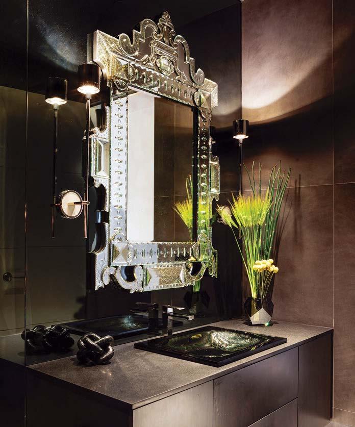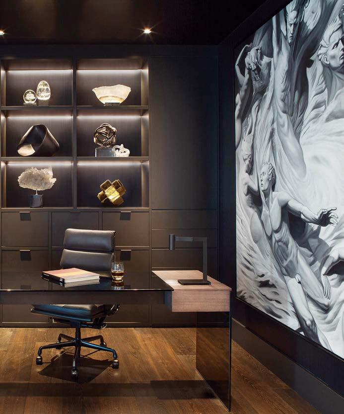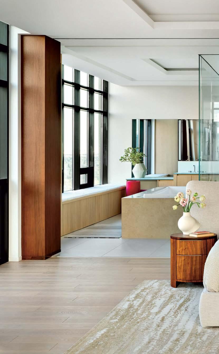 bedroom was also set behind a wall of the library, which blocked the view. Not only did the Pearsons desire the reassignment and revamp of key spaces, they also wanted to carve out separate bedrooms and bathrooms for their two children and find space to accommodate guests too. The limiting factors were, of course, the penthouse’s large but static footprint and the need to tie into the existing plumbing of the high-rise building.