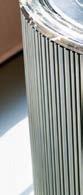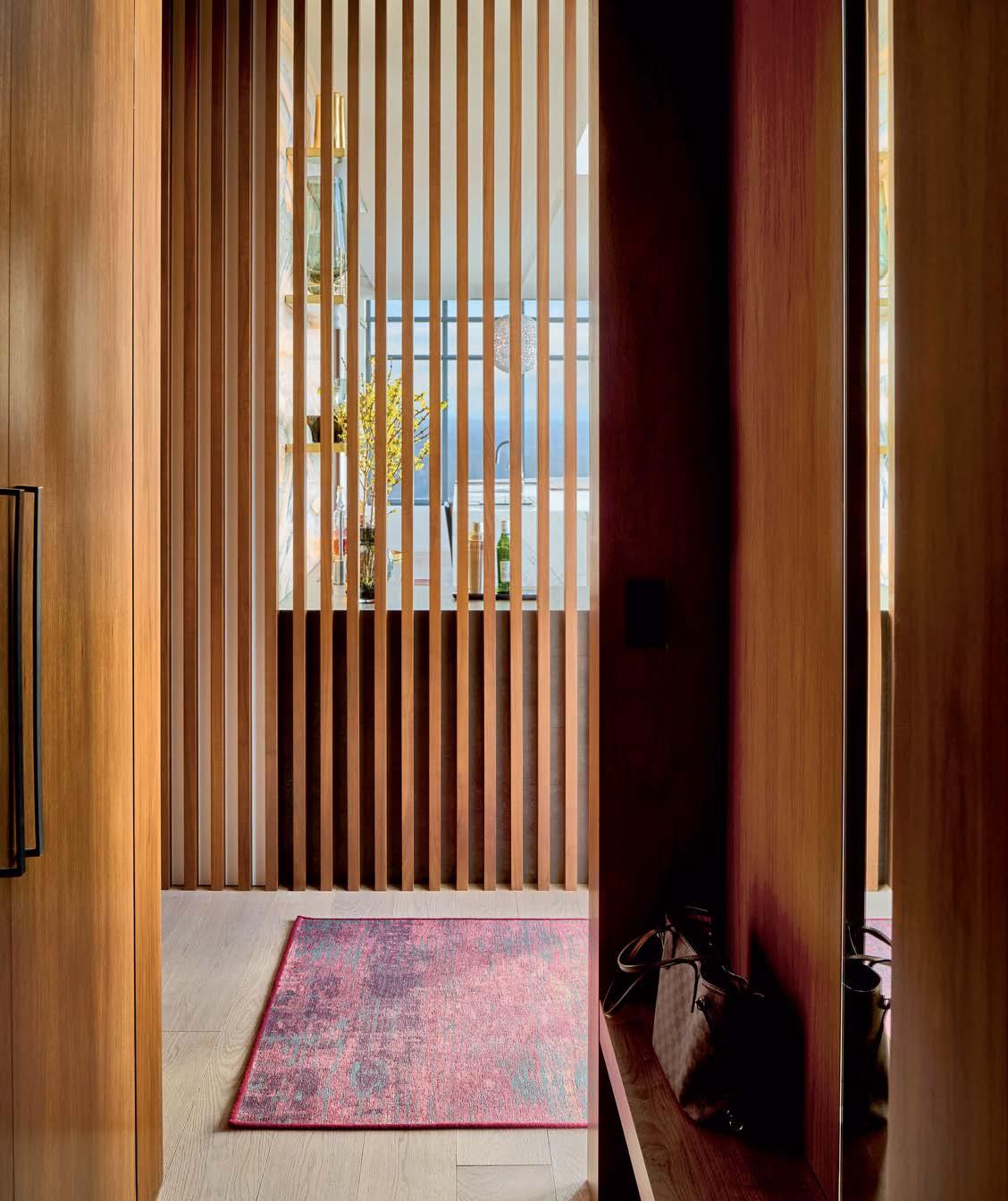 Walnut slats by Ark Woodworks greet guests with a peekaboo glimpse of the penthouse’s spectacular views. “This creates a moment and a pause, as there isn’t a traditional entryway here,” explains designer Anne Marie Ostmeyer. The rug is by Creative Flooring.