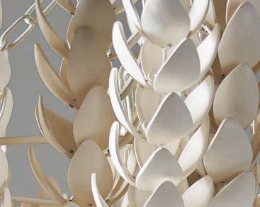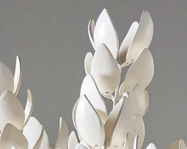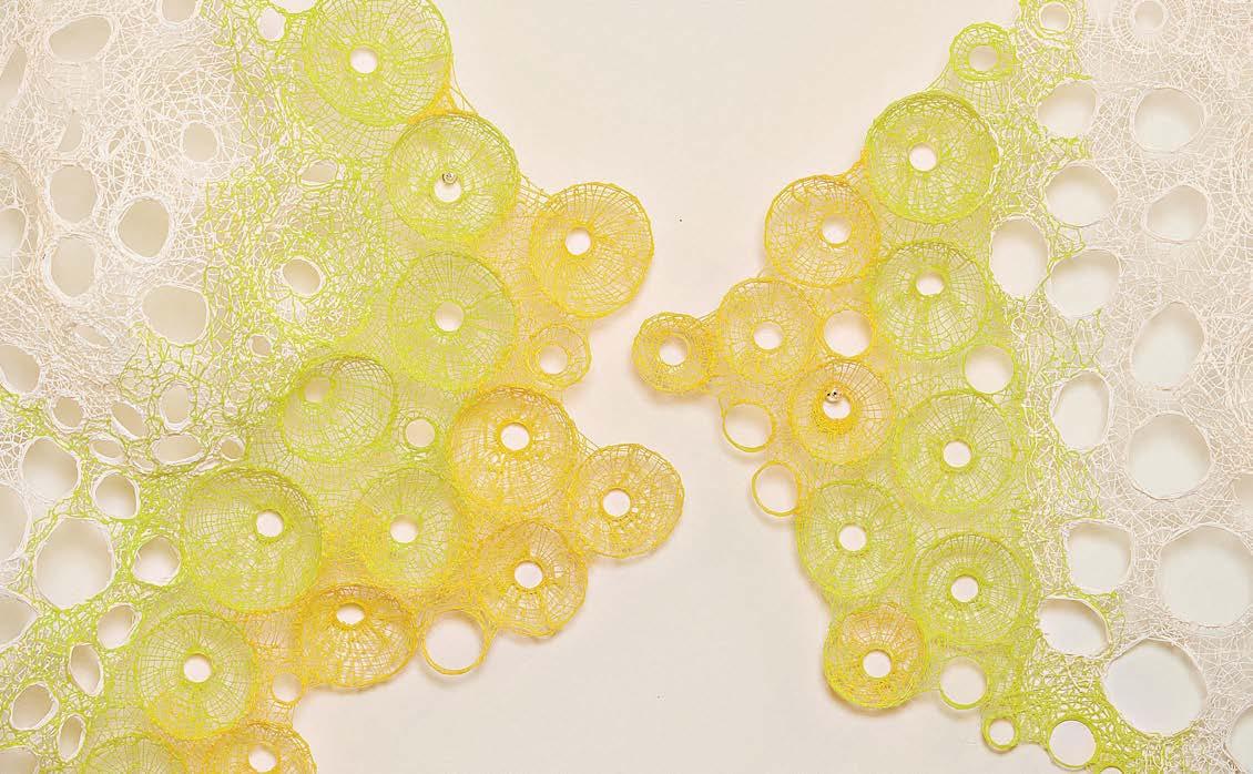 in bright hues. The PLA material doesn’t allow for a physical blending of different hues. “It never quite gets liquid, so you can’t mix shades like paint,” explains Stuart, who plays with layered, optical interactions instead. “I love joining and overlapping colors, exploring how looking through one affects the other,” she says.