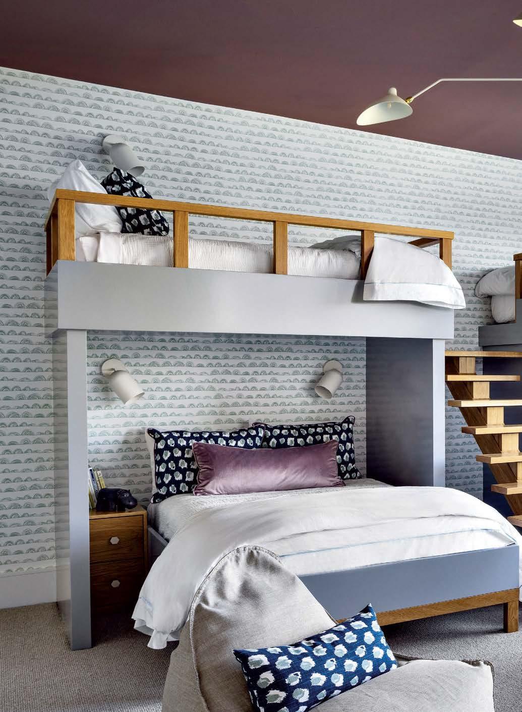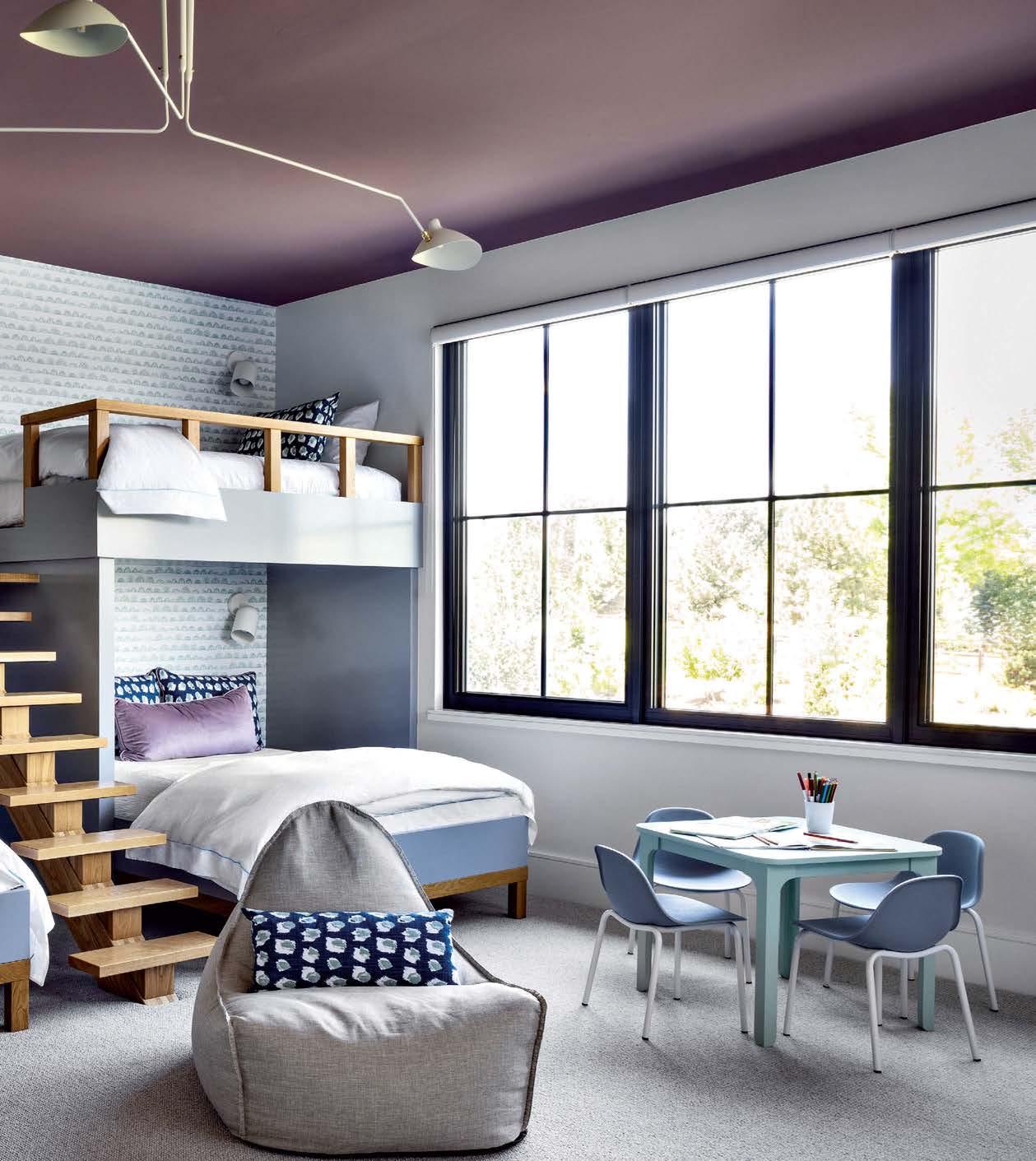 Scallop pattern and a ceiling coated in Benjamin Moore’s Cinnamon Slate bring playful notes into the bunk room.