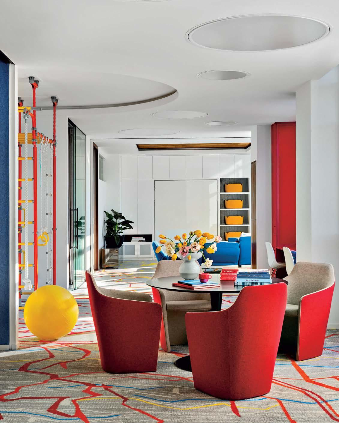 Opposite: Bold ShawContract carpeting sparked the primary color palette in the extended family room. The round table and red-and-beige chairs rest beside an indoor climbing gym for the children.