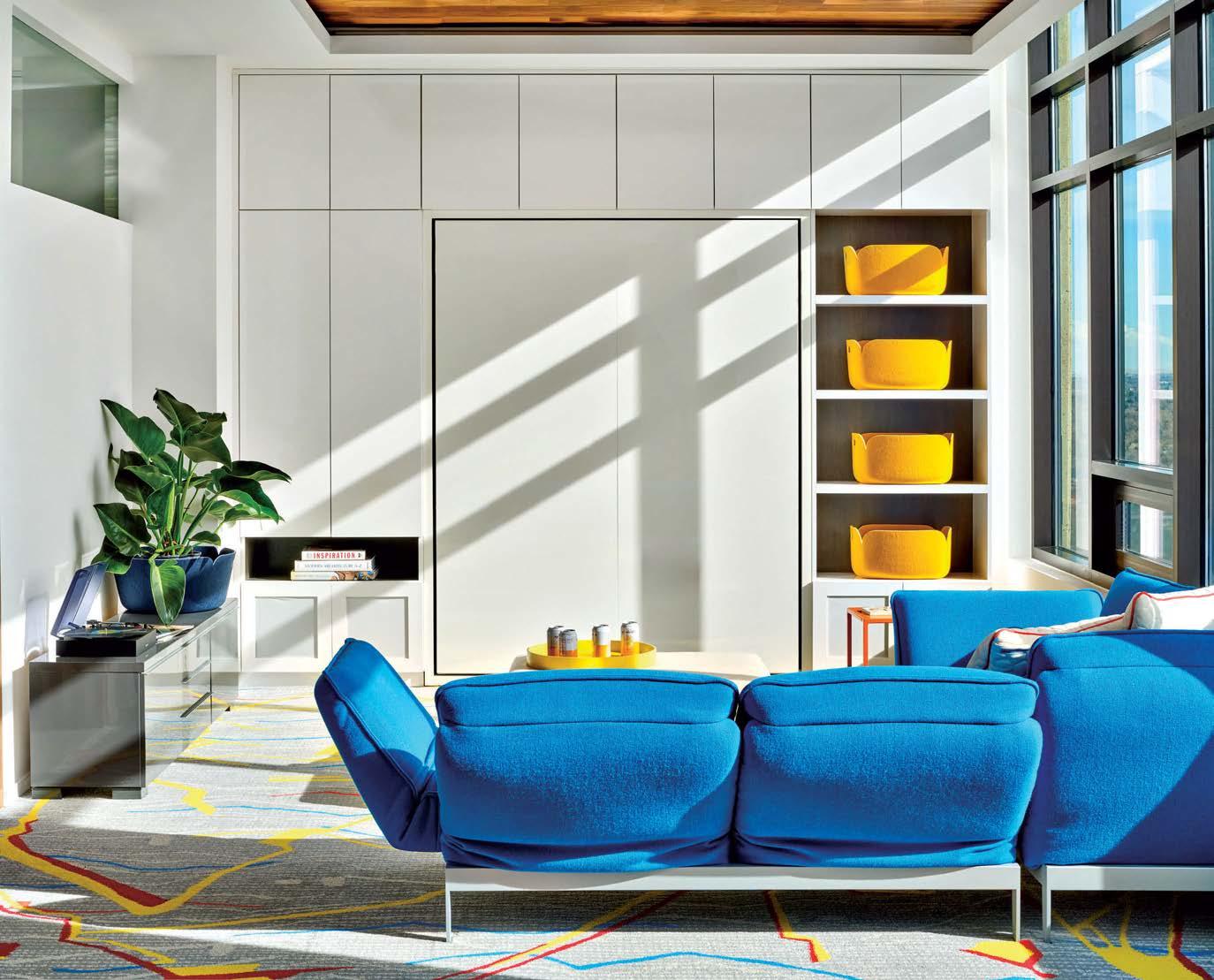 Above: Upholstered in a vivid blue fabric, a Rolf Benz sectional is a favorite gathering place within the flexible-use family room, where a hidden Clei wall bed folds down for guests. Muuto bins add a dash of visual excitement to the built-ins.