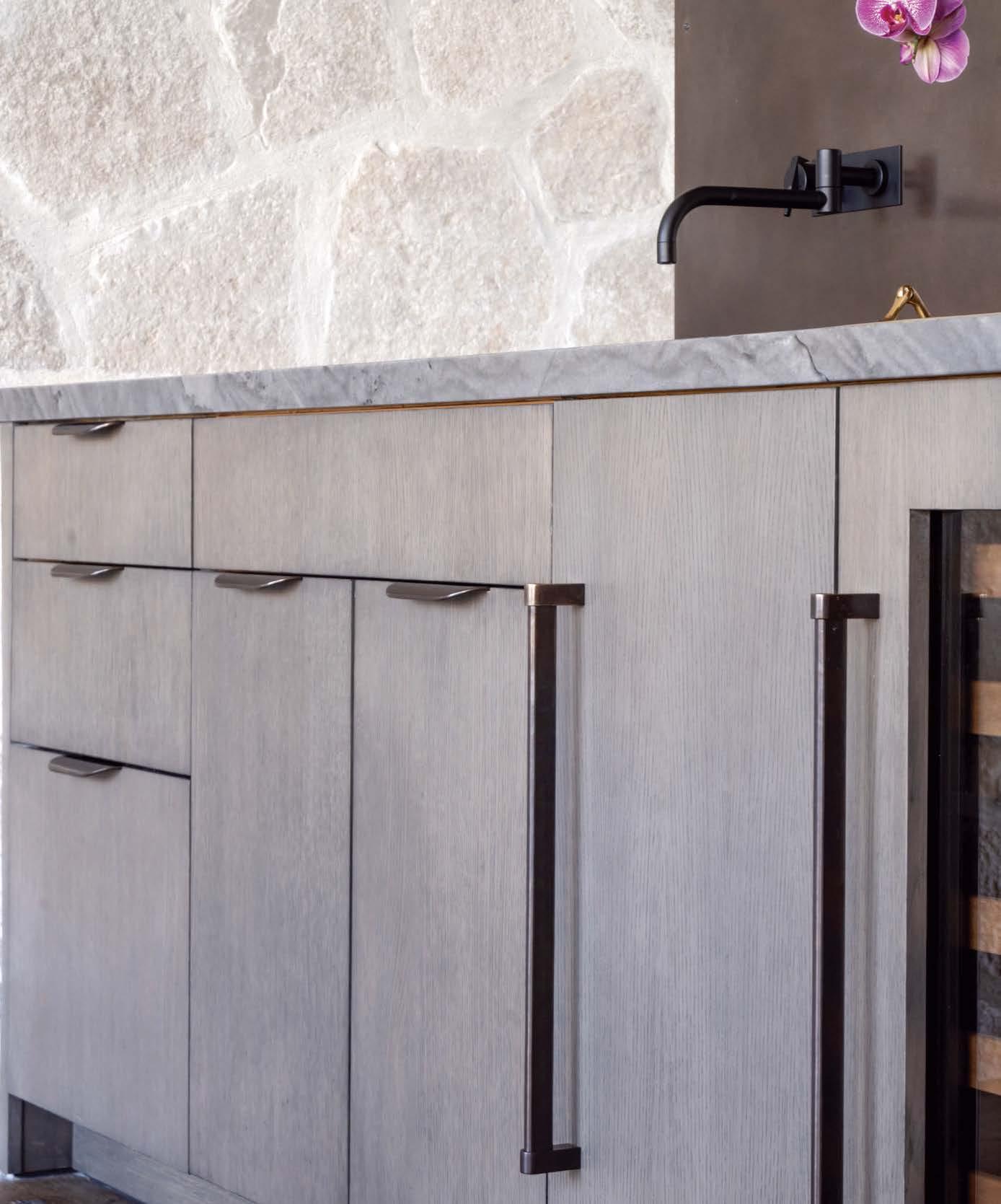 The main challenge for the designer, who collaborated with architect Eric Carlson and general contractor John Rottschafer, was to envision a home that would feel cozy when only the homeowners are in residence, but could also host overnights with their grandchildren and accommodate crowds for the couple’s frequent fundraising and philanthropic events. A layout capable of taking full advantage of the sun-drenched setting, with ample outdoor connections, was also a must. It was a tall order. What’s more, the homeowners were divided on what they envisioned for their new home’s exterior. “One wanted a clean modern style while the other insisted on having some traditional detailing,” recalls Carlson. His solution, in collaboration with Ekle, was to mix the two: The house’s contemporary architectural envelope is accented with classic elements like arched windows, heavy wood cornices and columns, all within a Mediterranean-inspired limestone façade in shades of bone, cream and pewter. “The large windows and low-pitched metal roof set the stage for a contemporary feel, while the traditional aspects bring in a sense of warmth and softness,” the architect goes on to explain. Carlson also placed pocketing sliders that seamlessly open up the house at multiple points, plus poised transom windows—most notably in an airy great room and in the owners’ bathroom—to usher in plenty of natural light. The flow of spaces is creatively layered, he says, and coffered ceilings and custom built-ins keep the proportions appropriate. “Each room you enter has a spatial surprise and all the outdoor connections make it feel particularly livable,” Carlson comments. The home’s undisputed showpiece, however, is its two-story great room marked by a stunning 22-foot-high, two-sided fireplace floating at its
