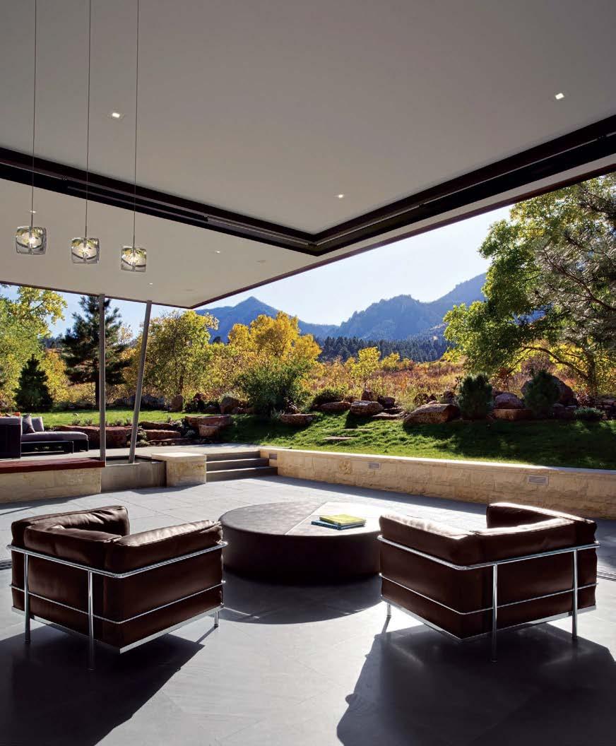 Top A wall of sliding glass opens to views of the Flatirons in Arch11’s Syncline House, a luxury LEED Gold home.
