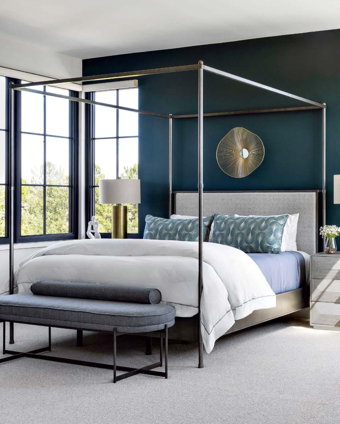 Opposite: Benjamin Moore’s deep blue-green Salamander sets the tone in a guest bedroom. The modern four-poster bed, curved bench and carved bedside chest are all from Universal Furniture. A decorative Uttermost mirror shines as an artful accent.