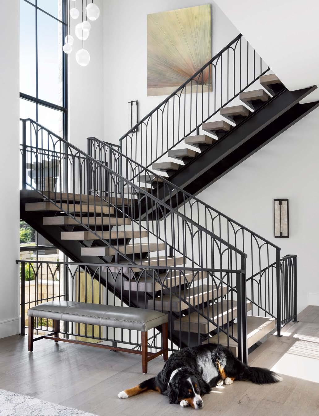 Bernese mountain dog Rico relaxes beside an Alder & Tweed Furniture bench in the entry. A John Pomp Studios pendant and Studio A Home sconces add illumination to the stairwell. Designer Corinne Ekle drew inspiration from old-world cathedrals when designing the custom iron handrail.