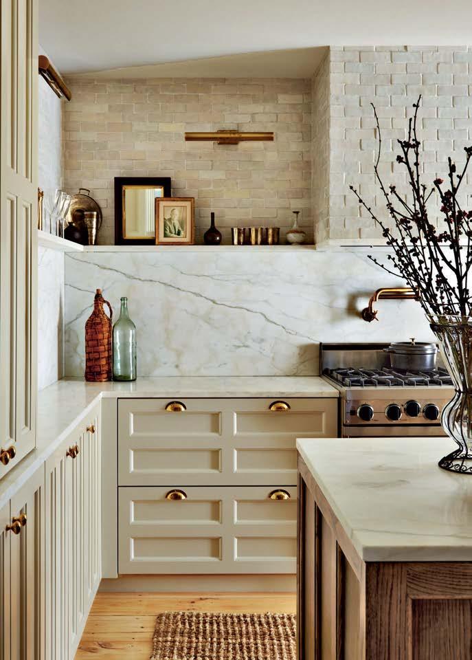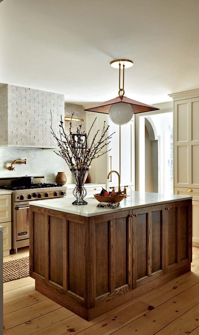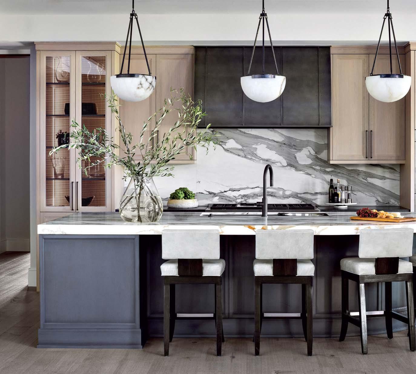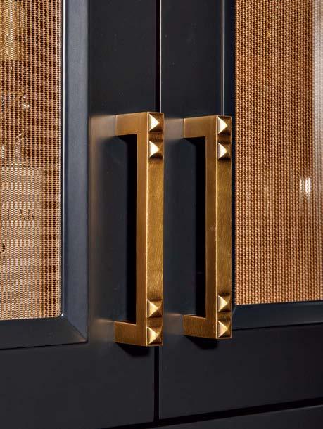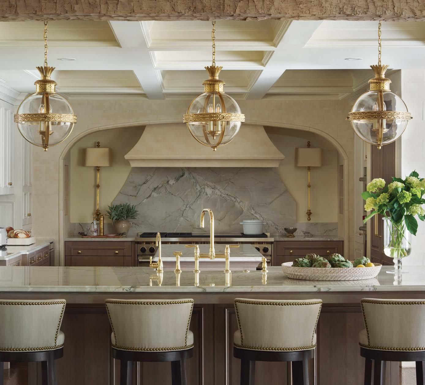 Above: Industrial touches dot the kitchen, from the custom metallic finish of the island and hood to the mesh behind the hutch’s glass. Visual Comfort & Co. pendants set off the Calacatta marble of the backsplash and island. The stools are ParishCo from C.A.I. Designs.