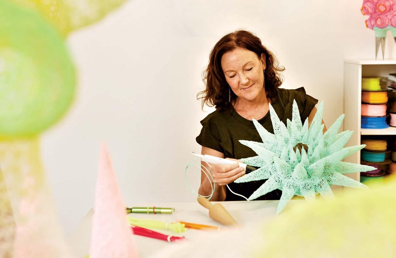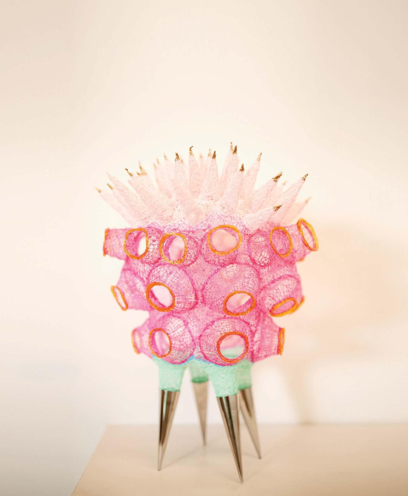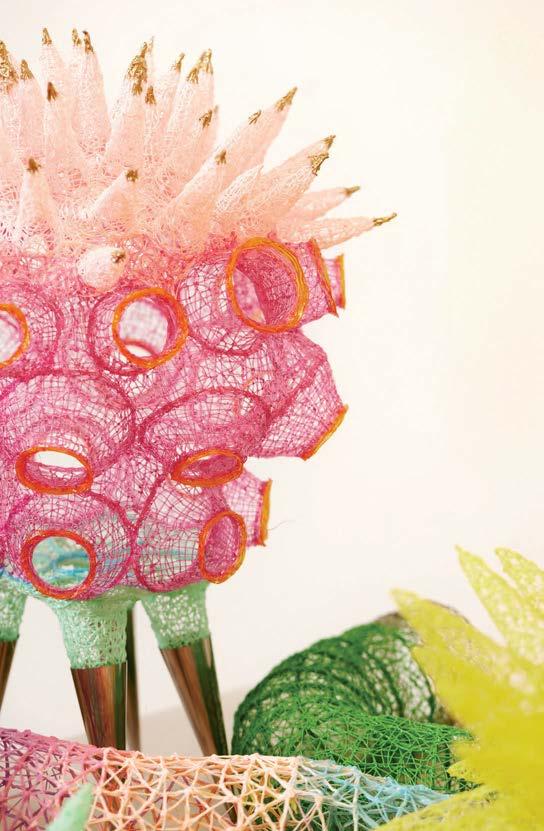 explains. “Using it is almost like knitting or crocheting; it’s a very meditative process. And it satisfied my urge to make marks, to use color and create three-dimensional sculptures all at once.”