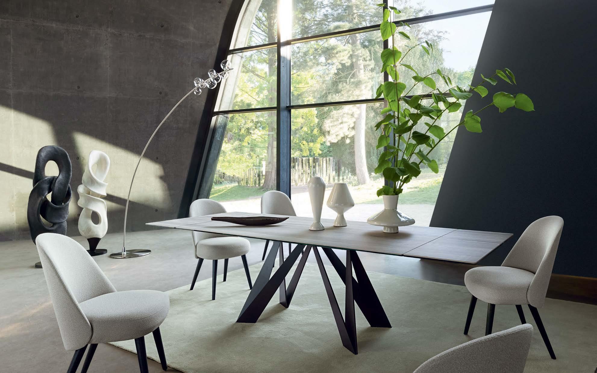 Above: Mark Albrecht Studio’s Eclipse Pendant Light hangs over RH’s Arles black oak table with Interior Icons chairs in the dining area. The art is by Damien Hirst.