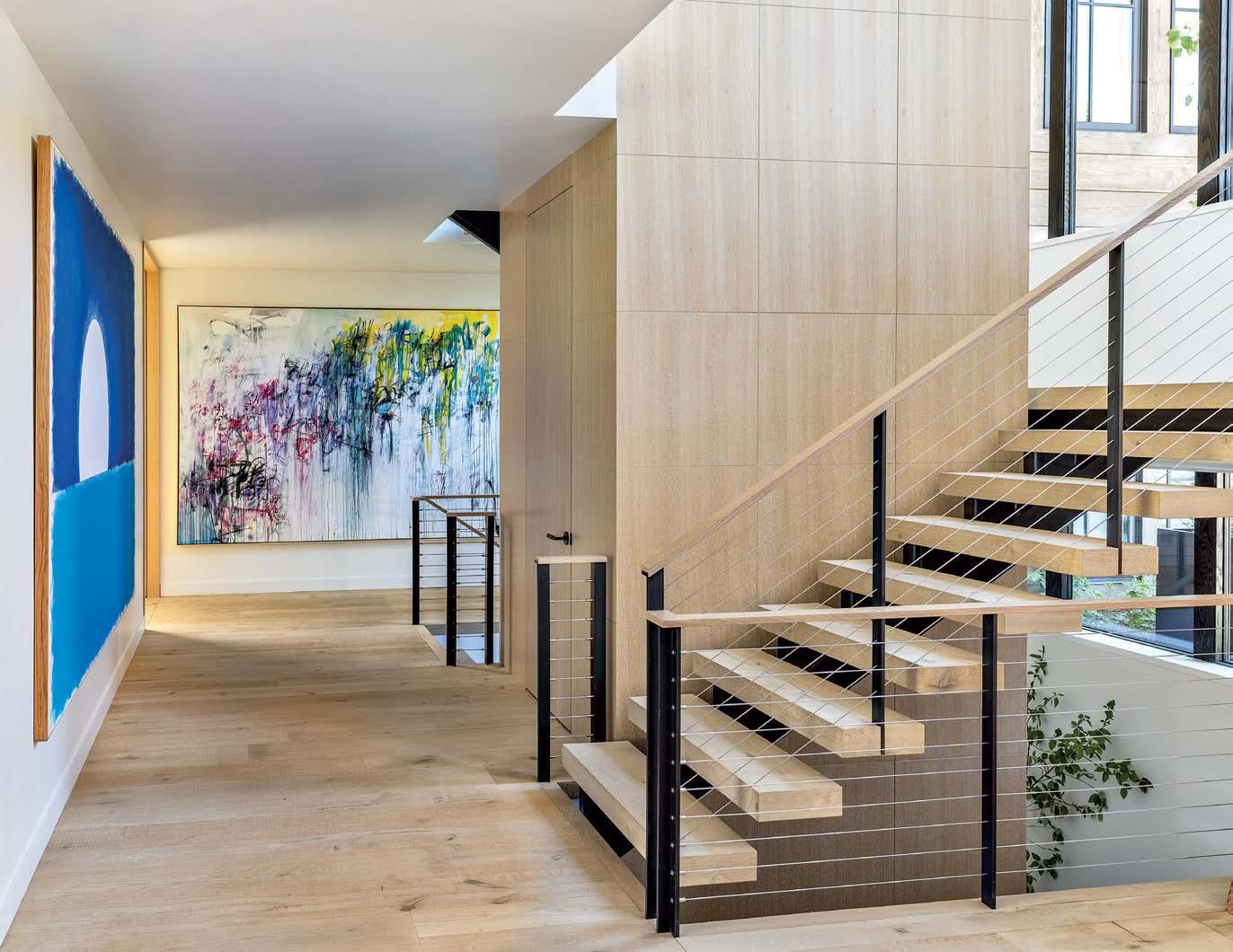 Rift-sawn white oak unites the flooring, elevator shaft and floating staircase treads, creating an architectural focal point. Artwork by Ugo Rondinone, opposite the elevator door, and Francesco D’Adamo create a gallery-like feel in the main hall.