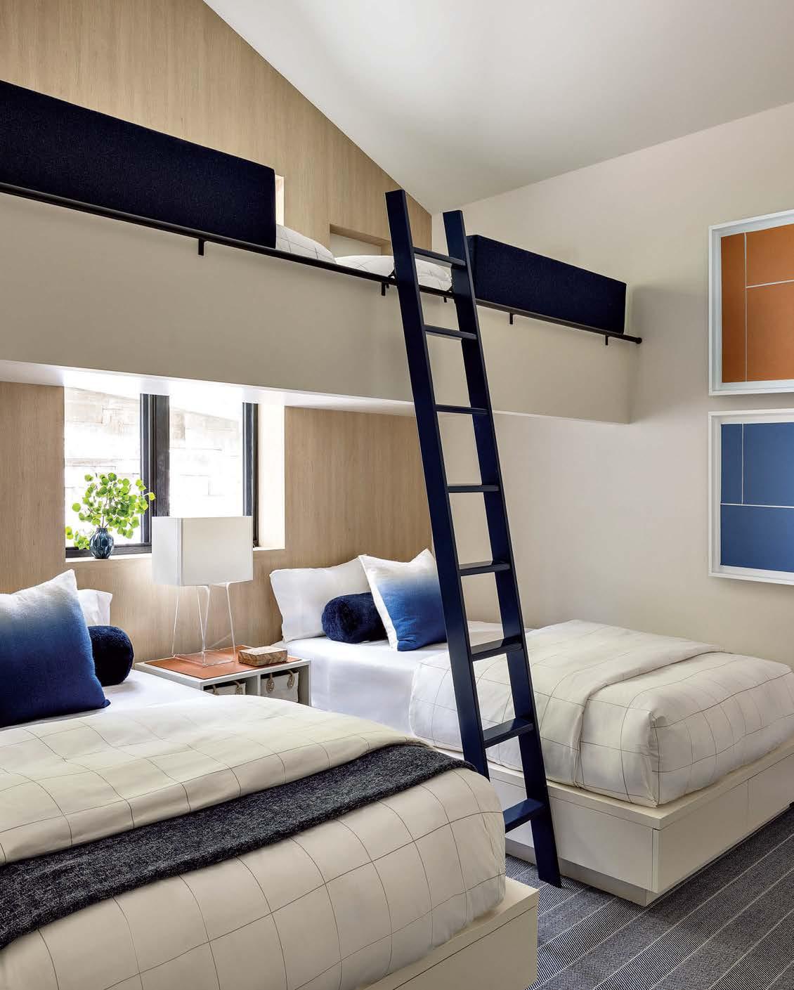 Opposite: In the bunk room, lofted twin beds atop custom queen-sized beds host lively sleepovers. A bespoke dresser showcases Pablo Designs’ Tube Top table lamp.