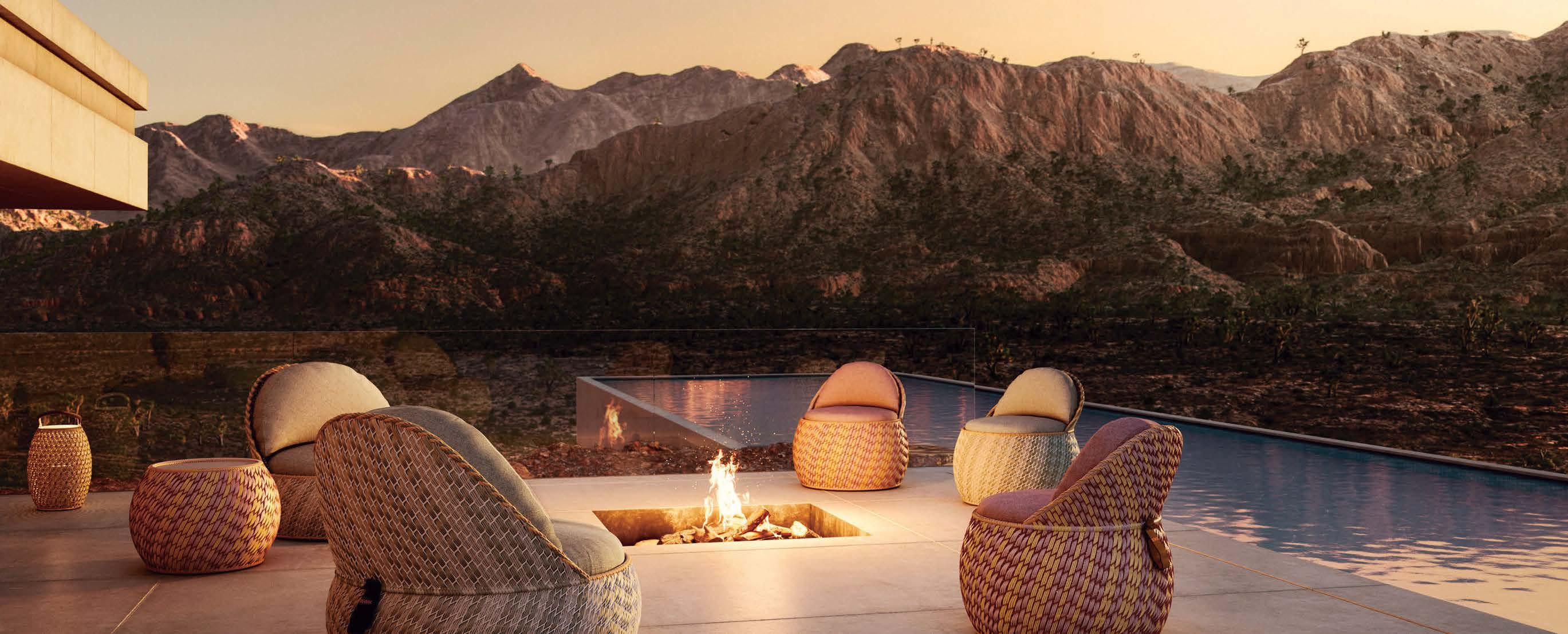 The green roof topping the living room helps tie the home back to the landscape and ensures that bedrooms on the top level enjoy a verdant view. A dining table and chairs from Knoll are positioned on the terrace near a fire feature, overlooking the pool.
