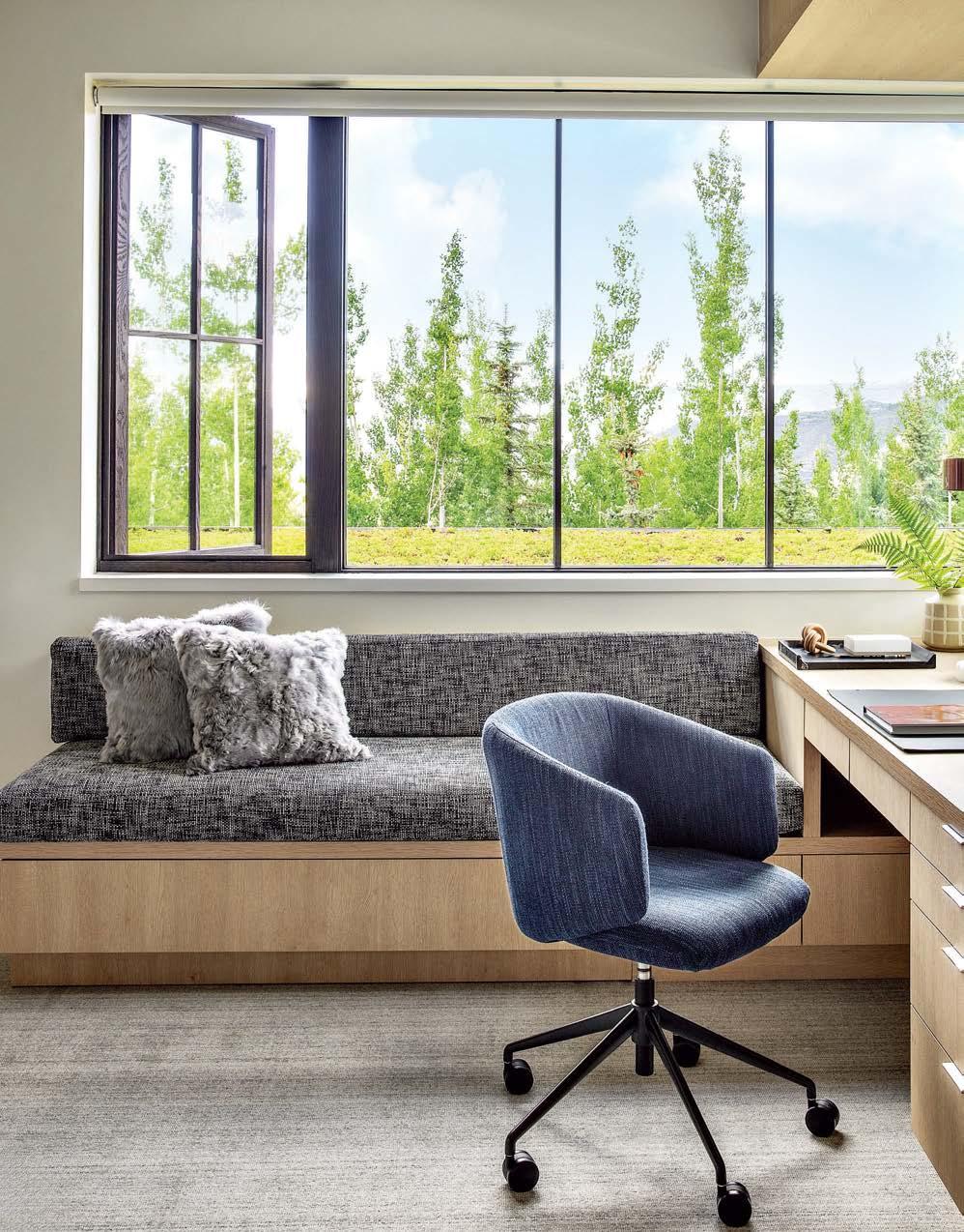 A breakthrough came when Ostmeyer moved the kids’ bedrooms into the interior—versus against the perimeter windows—giving them glass walls kitted out with privacy shades so they could keep the view. “That totally opened up one side of the residence,” Ostmeyer points out. The designer also got creative by making spaces like the family room more flexible, fitting in a Murphy bed and partitions that allow it and an attached bath to moonlight as temporary guest quarters. And in the primary suite—which now enjoys great sight lines—Ostmeyer cleverly employed sliding doors to give the Pearsons the ability to seal off their space entirely or to solely close away their sleeping area but leave the seating section open when they entertain.