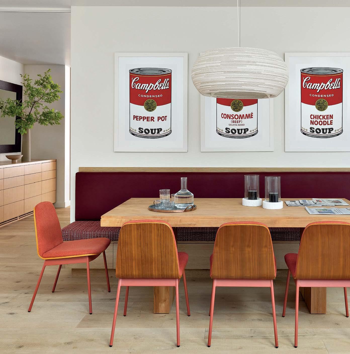 Left: Below framed prints of Andy Warhol’s iconic soup cans, the breakfast nook’s bespoke banquette is upholstered in fabrics from Rubelli and Architex. The teak table is from Design Within Reach and the chairs are Industry West. The light fixture is Graypants.
