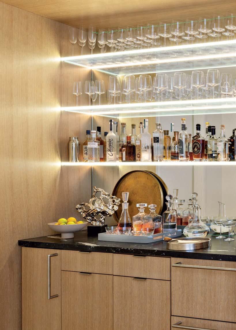 Above: Marquina quartzite counters top the white oak cabinetry of a bar area tucked into the main hall near the living room. Floating glass shelves are backlit and appear extra deep thanks to an antique mirror backsplash.