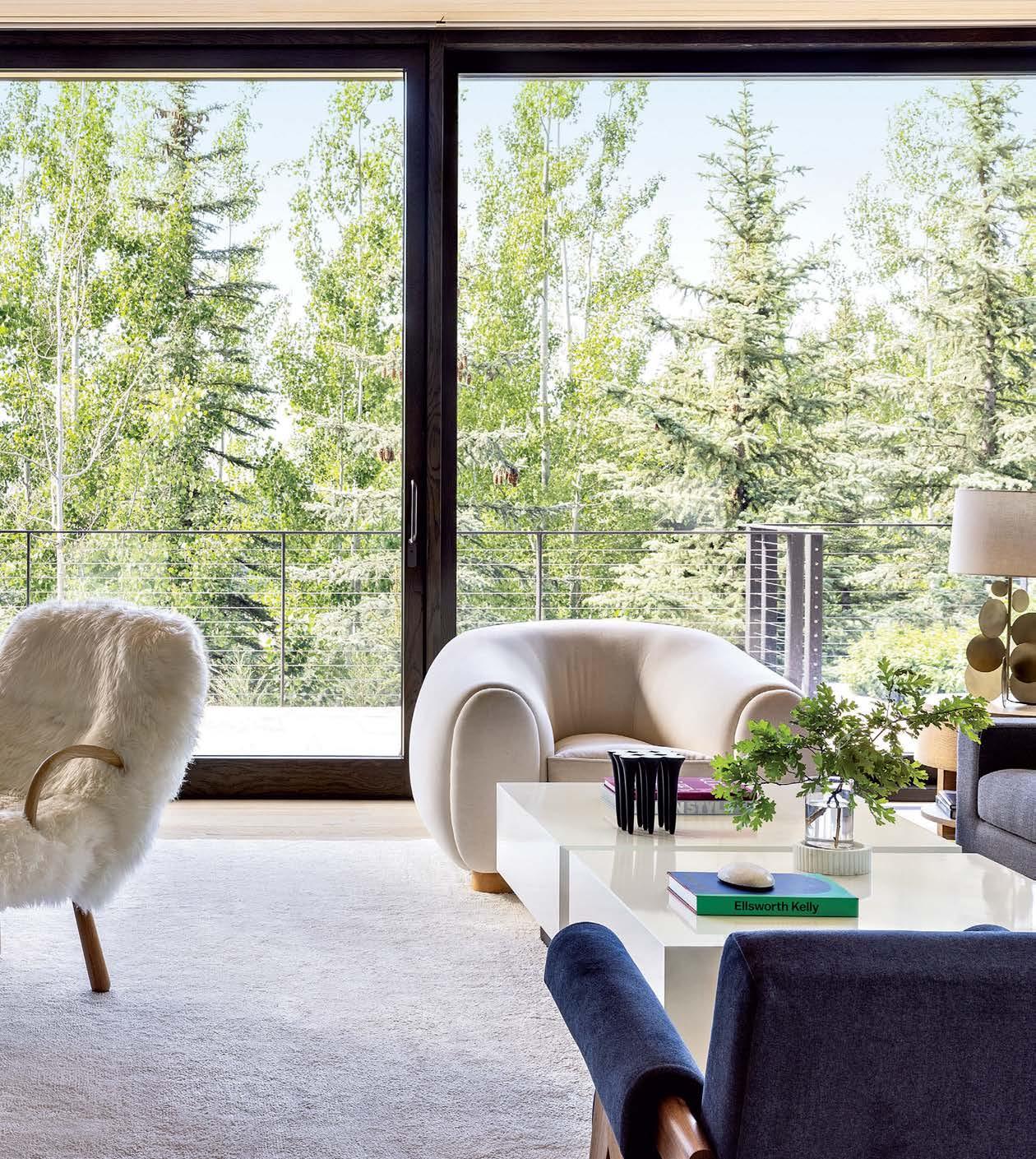 But to make certain those hues—and that view—could properly shine, Ostmeyer and the Pearsons, joined by general contractor William VonFeldt, first tackled a couple design pain points. The residence had a massive stone fireplace and beautiful-yet-heavy wood paneling that conspired to pull attention from the stunning vistas. “We all felt like, my gosh, there was so much potential for celebrating and capturing these views even more,” recalls Ostmeyer. Out came the traditional paneling and the fireplace’s stone, swapped for a modern white surround that stretches to the ceiling. It emphasizes the room’s height without calling attention to itself, save for an angled detail “that’s subtle and still so elegant,” muses Ostmeyer.