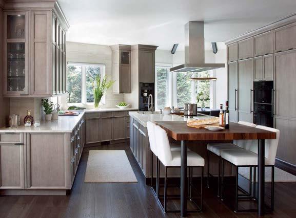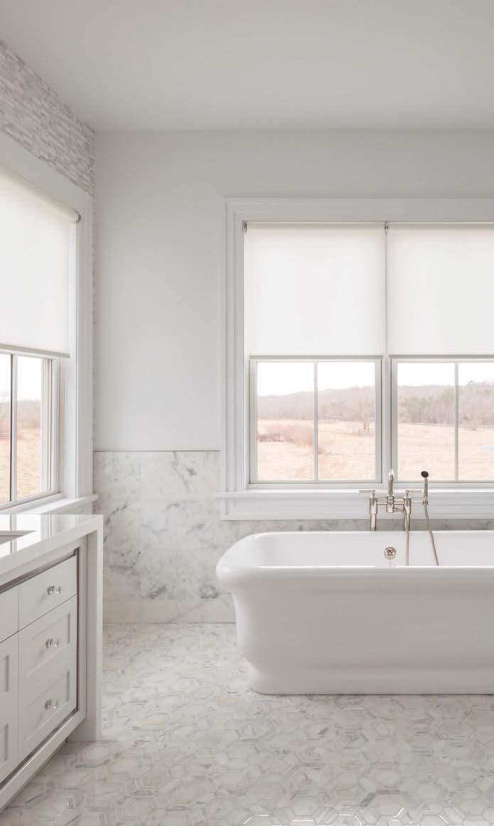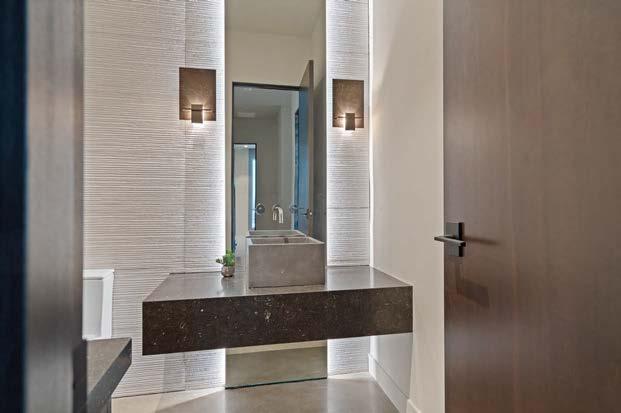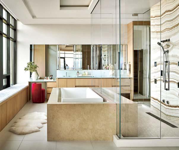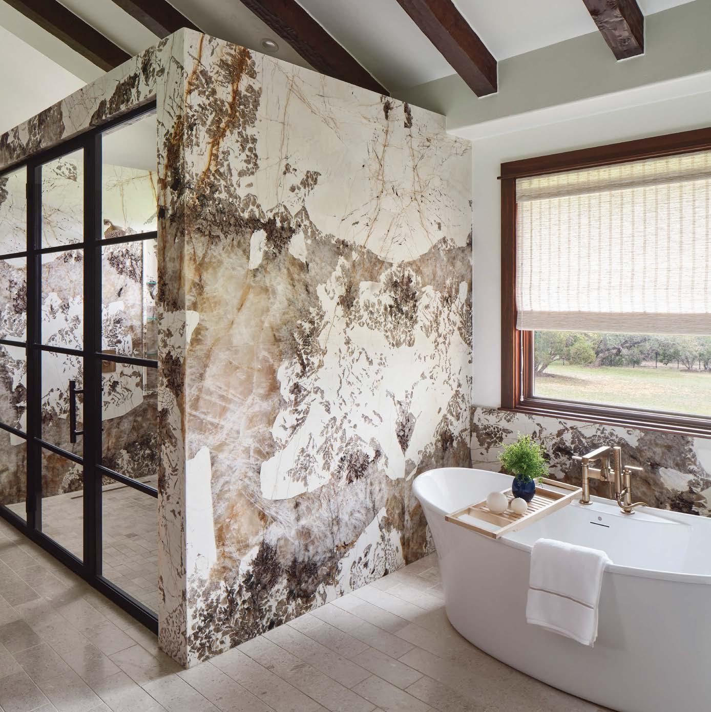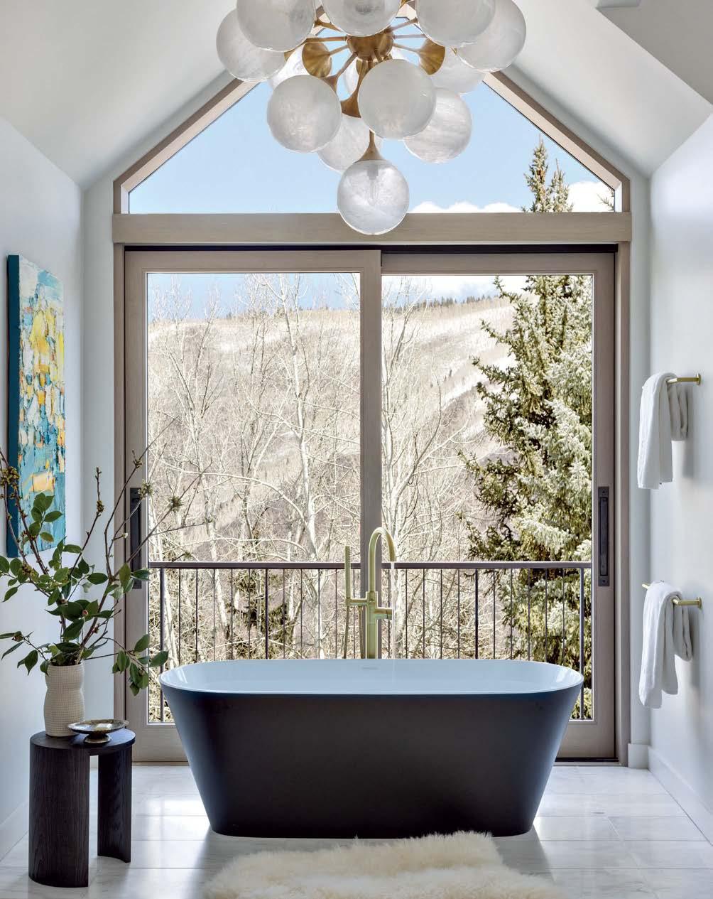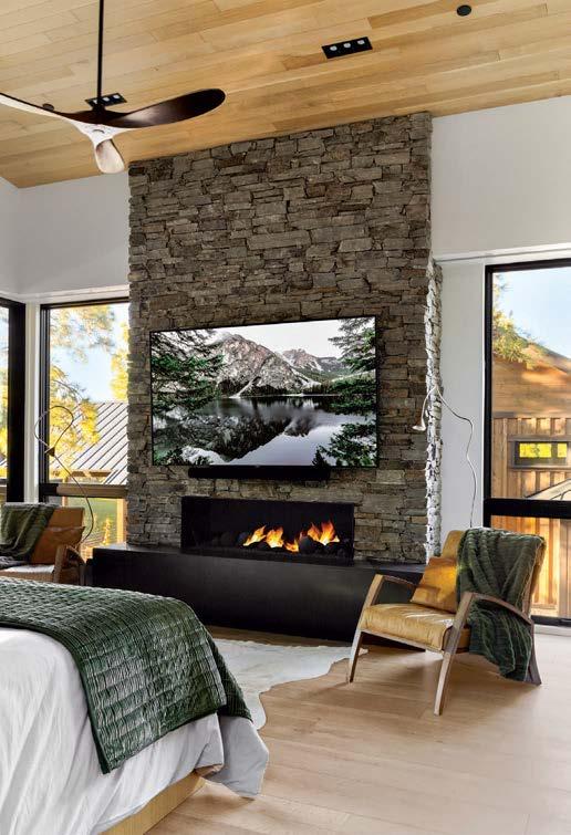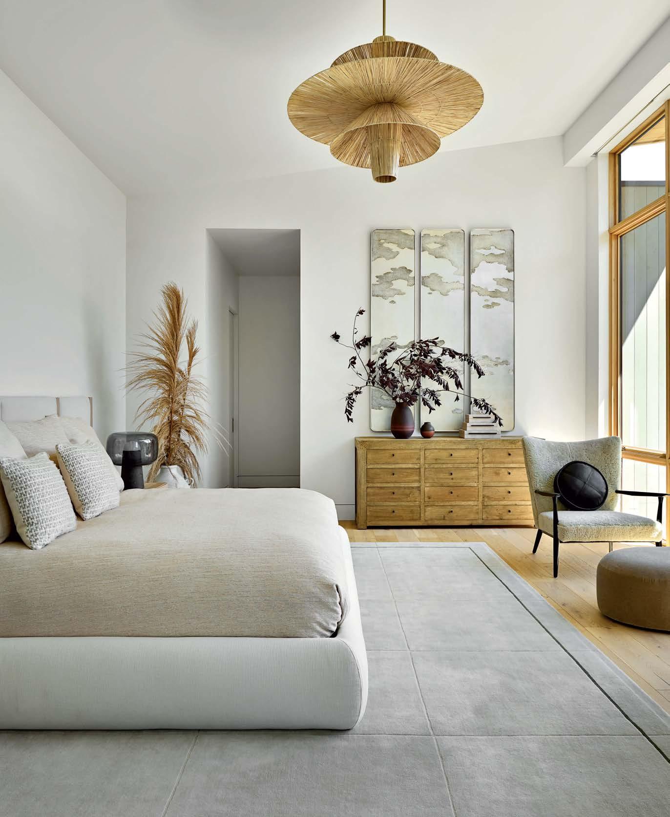 But it’s the homeowners’ private quarters, expanding across the entire third-floor apex of the structure’s “A,” that became the exclamation mark of this house—a quiet one, that is. A sleek, custom black steel fireplace provides warmth to the neutral-toned bedroom’s seating and sleeping areas, which are tucked under opposite dormers. “We softened the angular architecture with subtly curved furnishings,” says Broughton of the space’s retreat-like ambience. The primary bathroom continues the away-fromit-all aesthetic with a freestanding tub poised to contemplate the northern landscape. “Our job is to delight our clients and give them things they didn’t even know they needed,” Broughton concludes. And here, the result definitely encourages lingering.