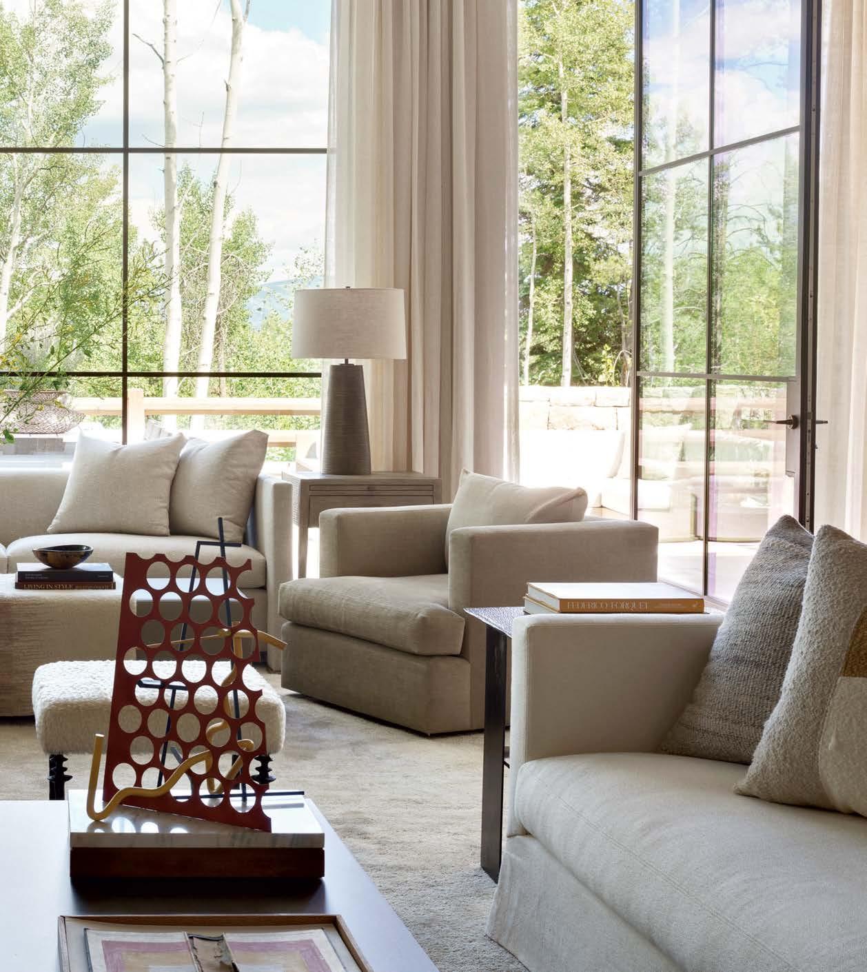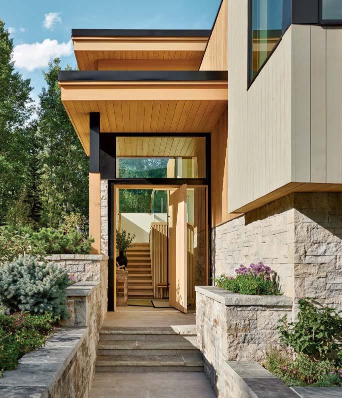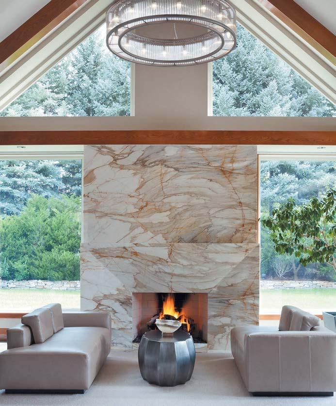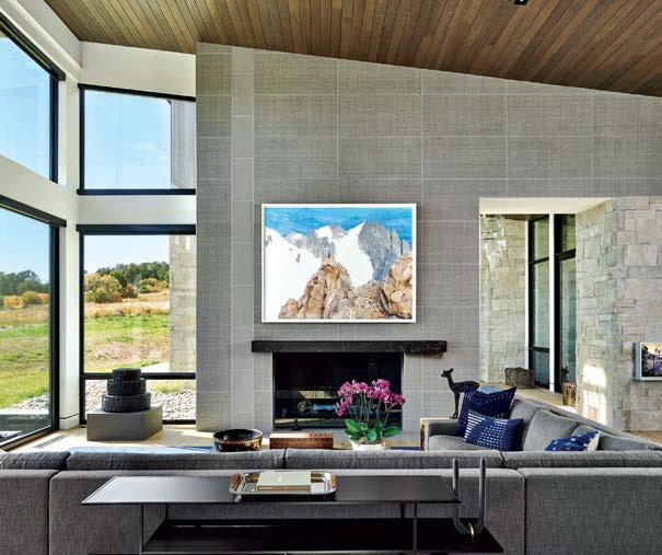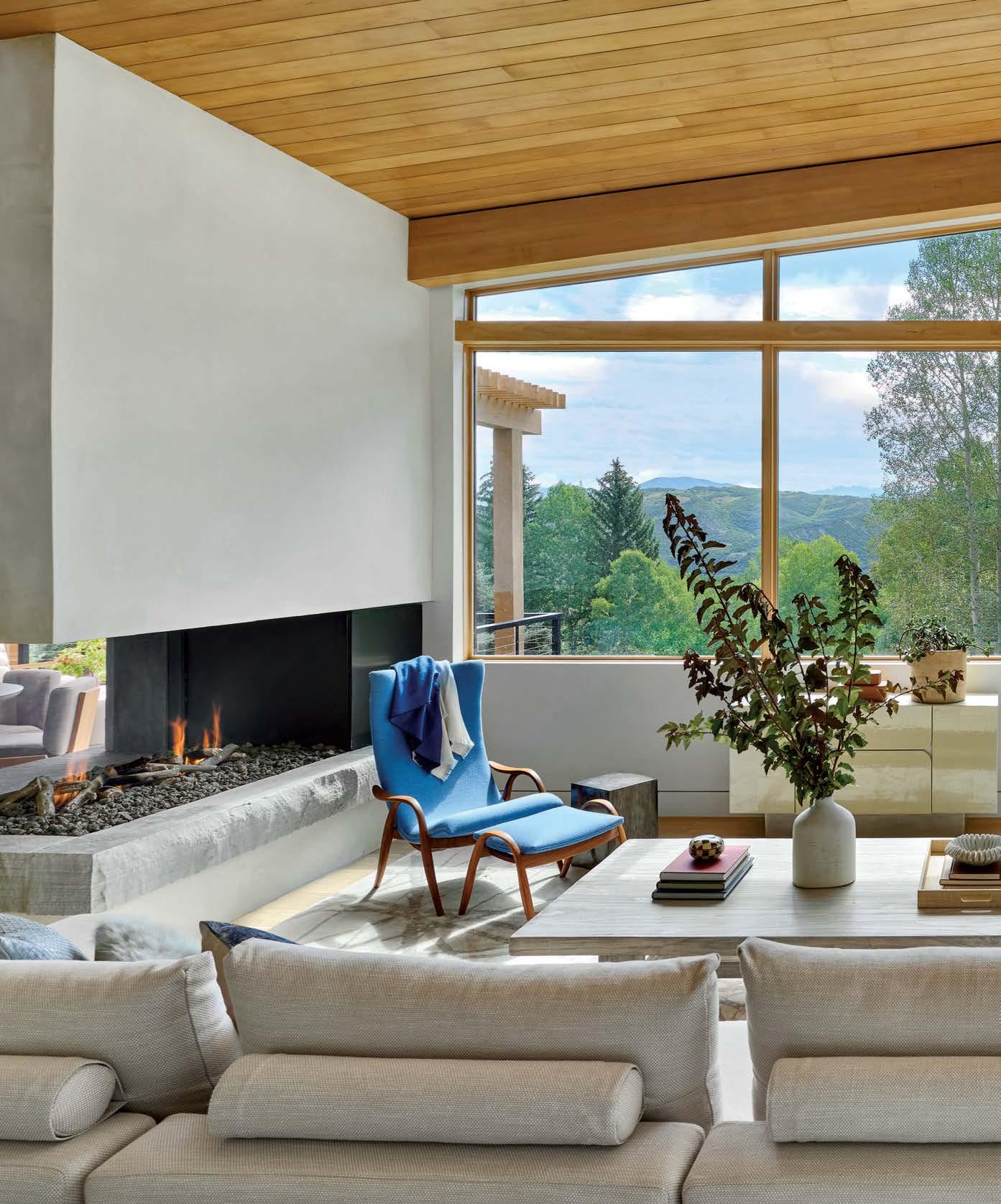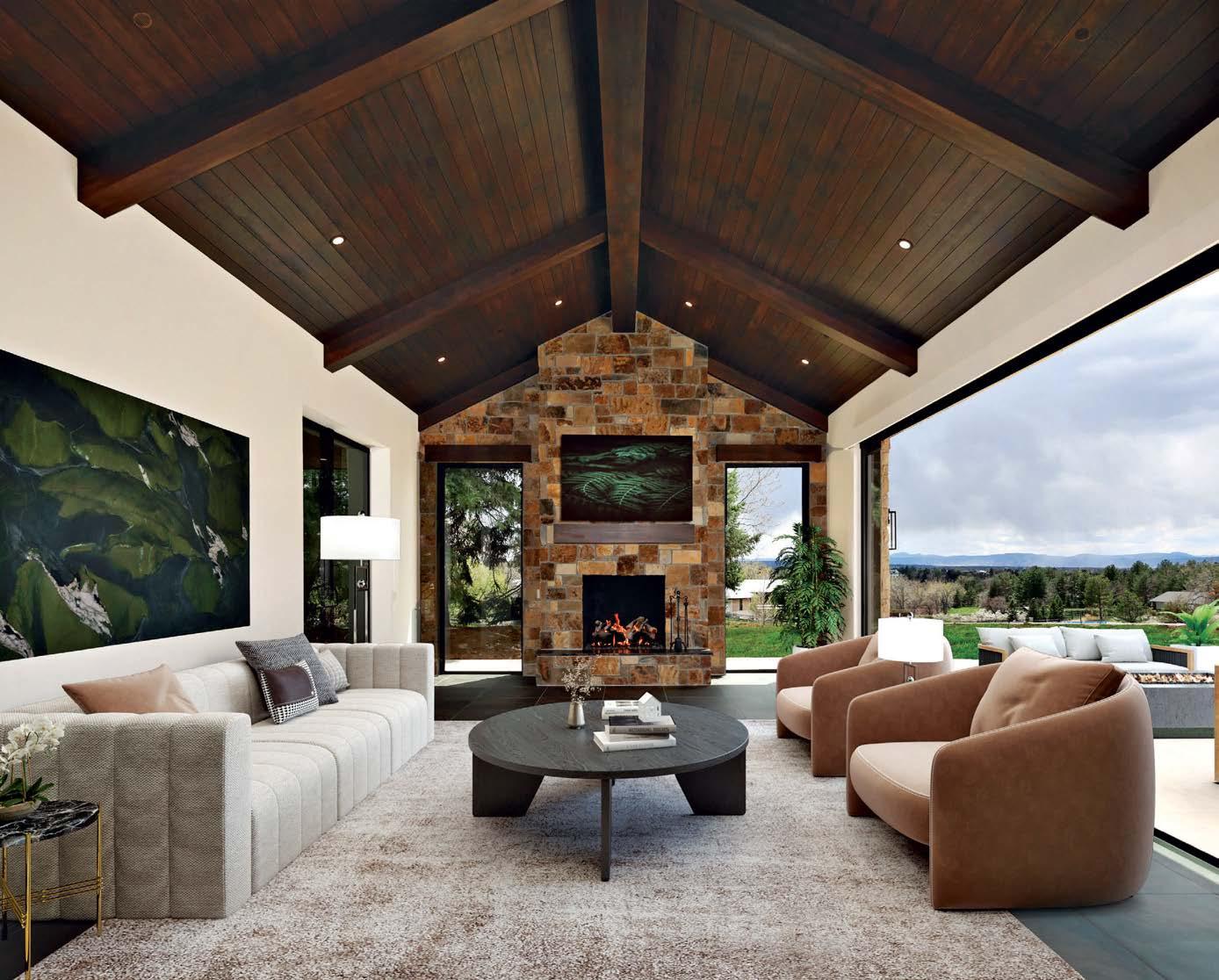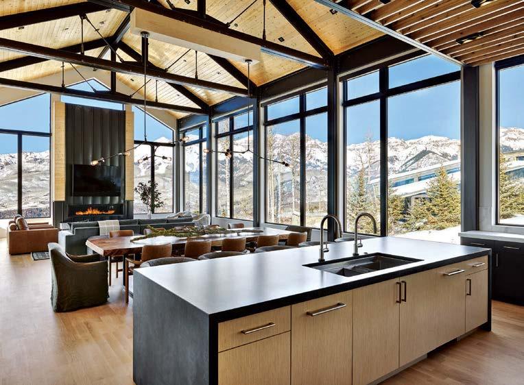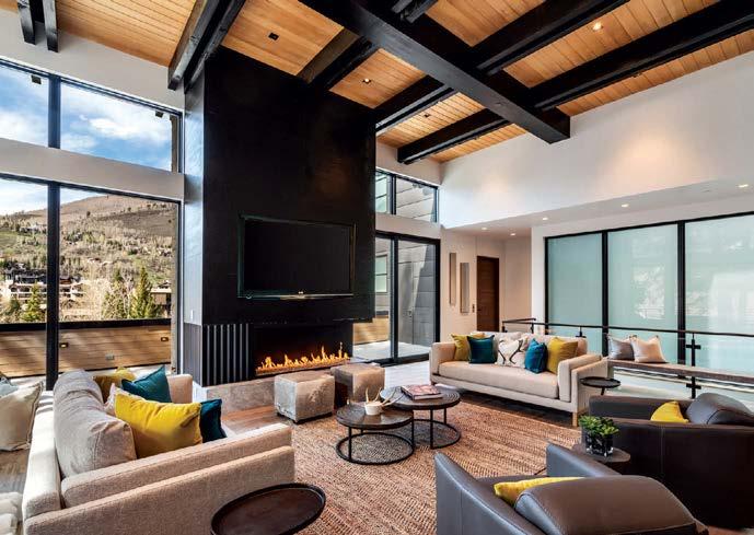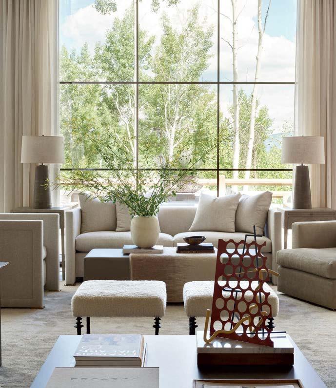 ON THE COVER: Rowland+Broughton paired a wall of Black Cardoso granite with a grid-patterned white oak ceiling to create a living area rich with contrast in a renovated Aspen home. Two Tacchini tables topped with Sahara Noir marble layer in more visual interest. The chair is RH and the rug is Rosemary Hallgarten. Page 170