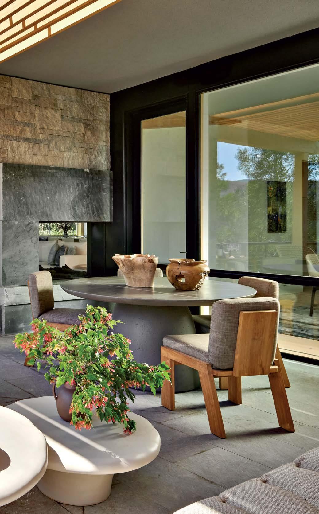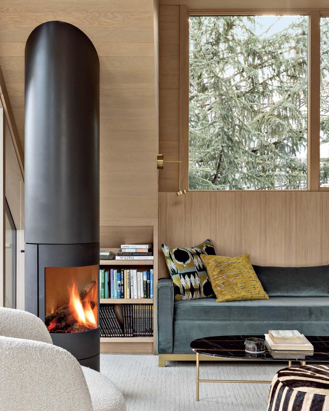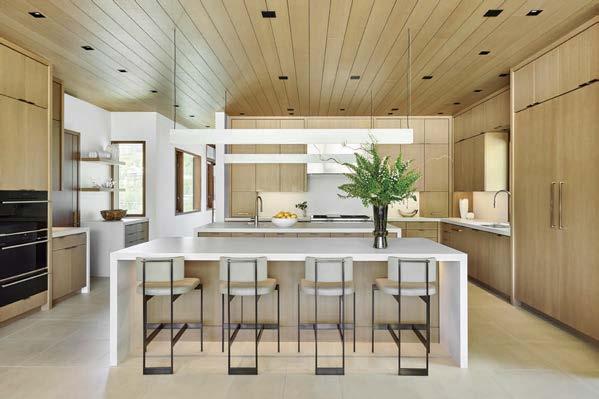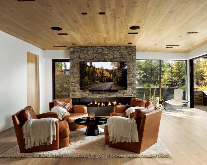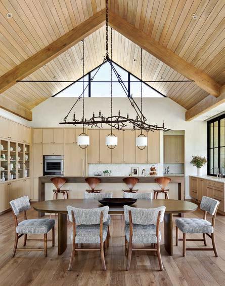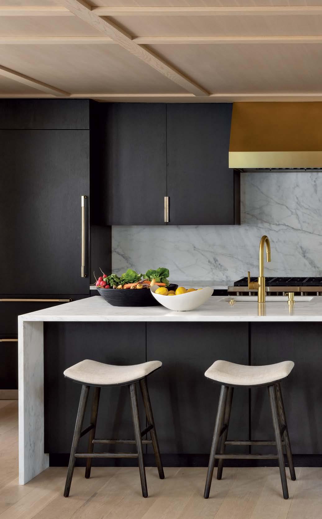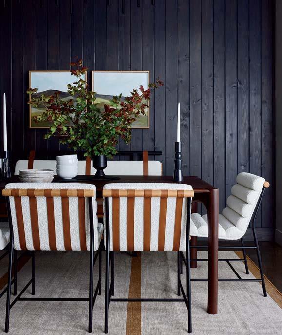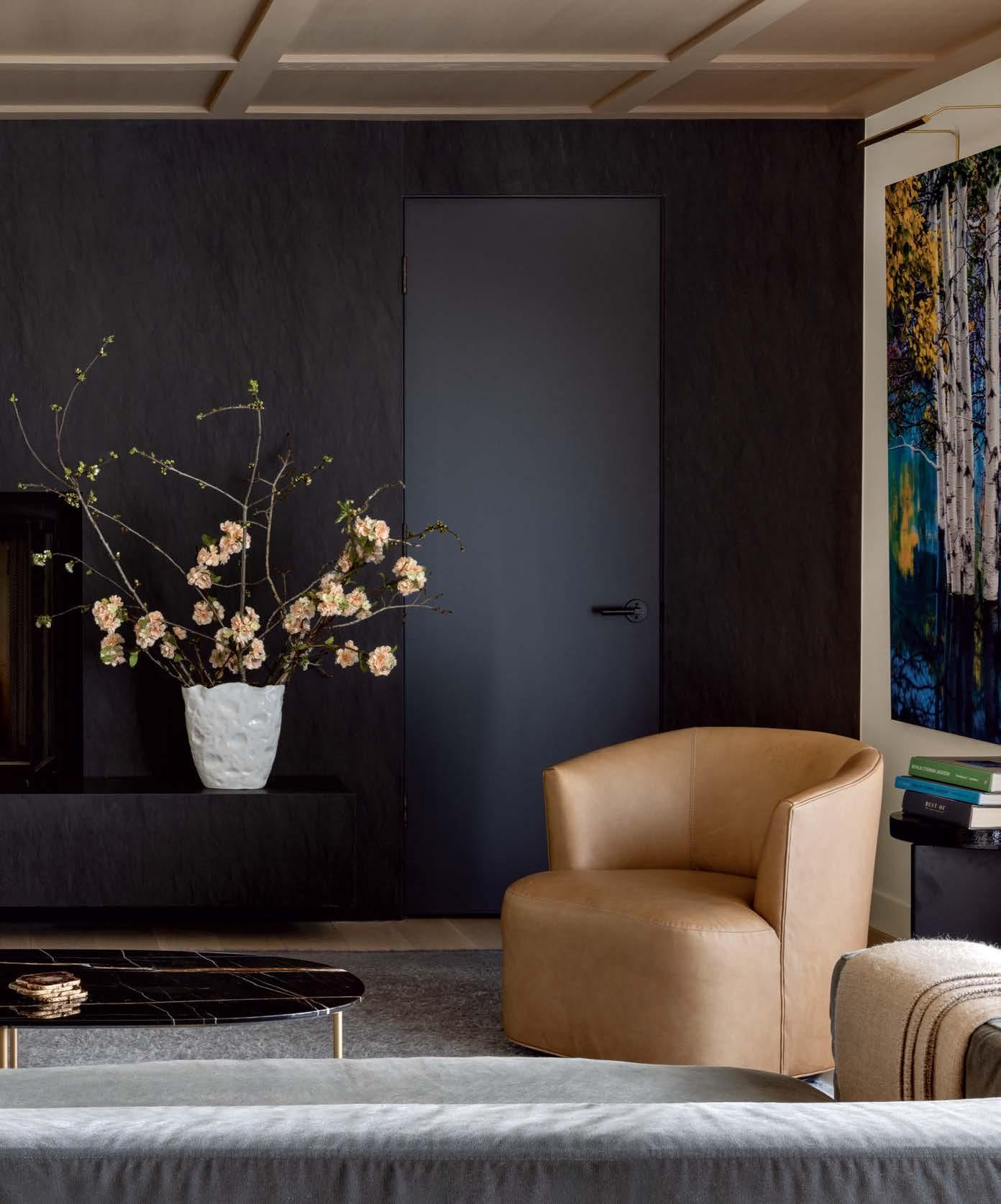 ON THE COVER: Rowland+Broughton paired a wall of Black Cardoso granite with a grid-patterned white oak ceiling to create a living area rich with contrast in a renovated Aspen home. Two Tacchini tables topped with Sahara Noir marble layer in more visual interest. The chair is RH and the rug is Rosemary Hallgarten. Page 170
