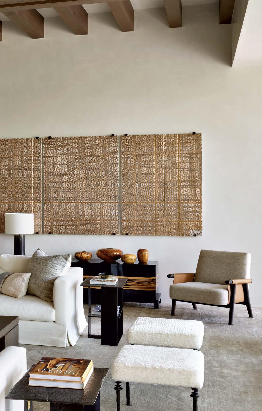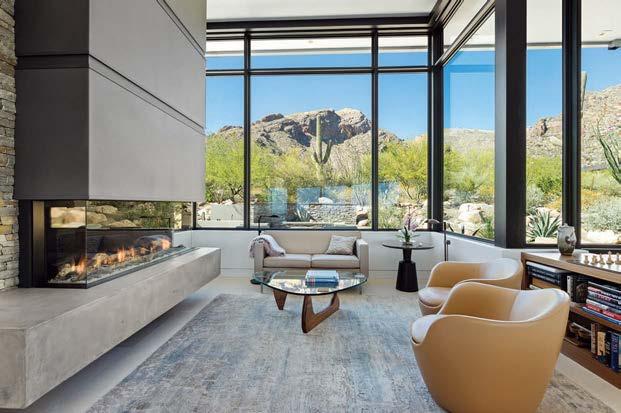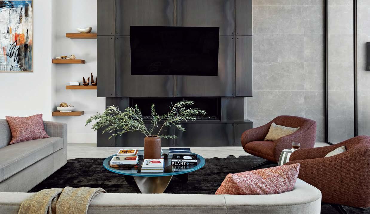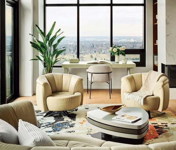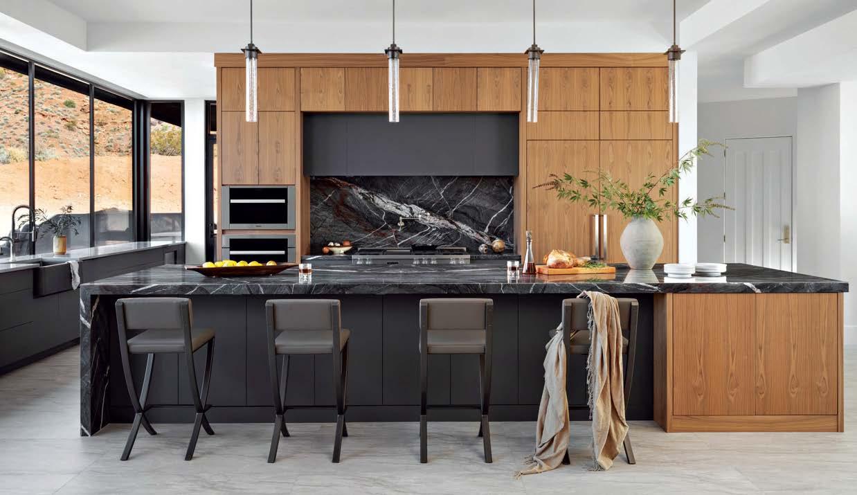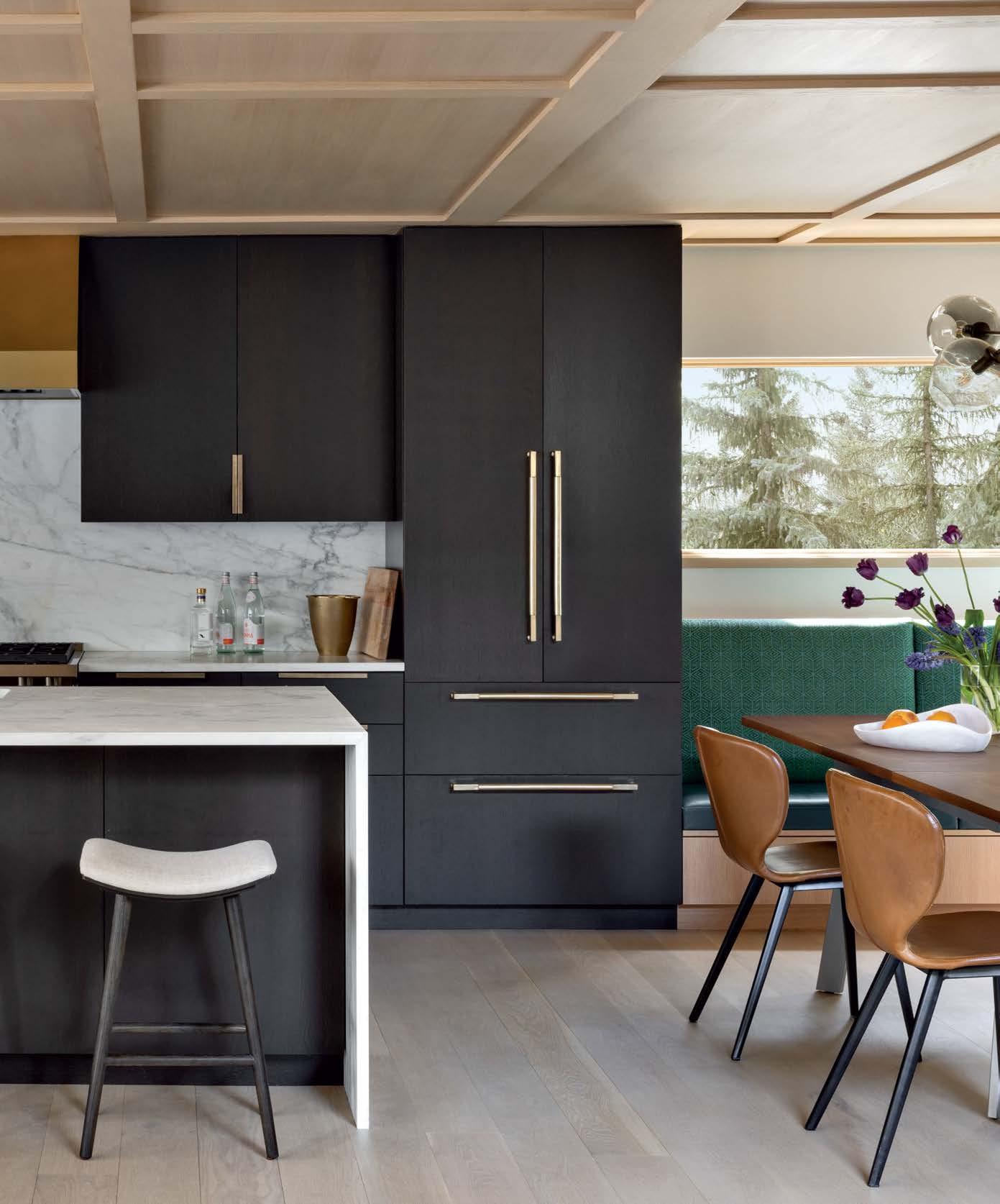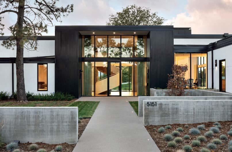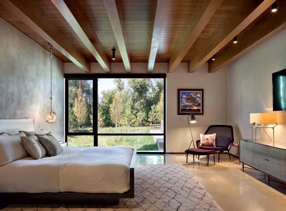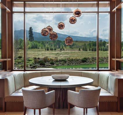 ON THE COVER: Rowland+Broughton paired a wall of Black Cardoso granite with a grid-patterned white oak ceiling to create a living area rich with contrast in a renovated Aspen home. Two Tacchini tables topped with Sahara Noir marble layer in more visual interest. The chair is RH and the rug is Rosemary Hallgarten. Page 170