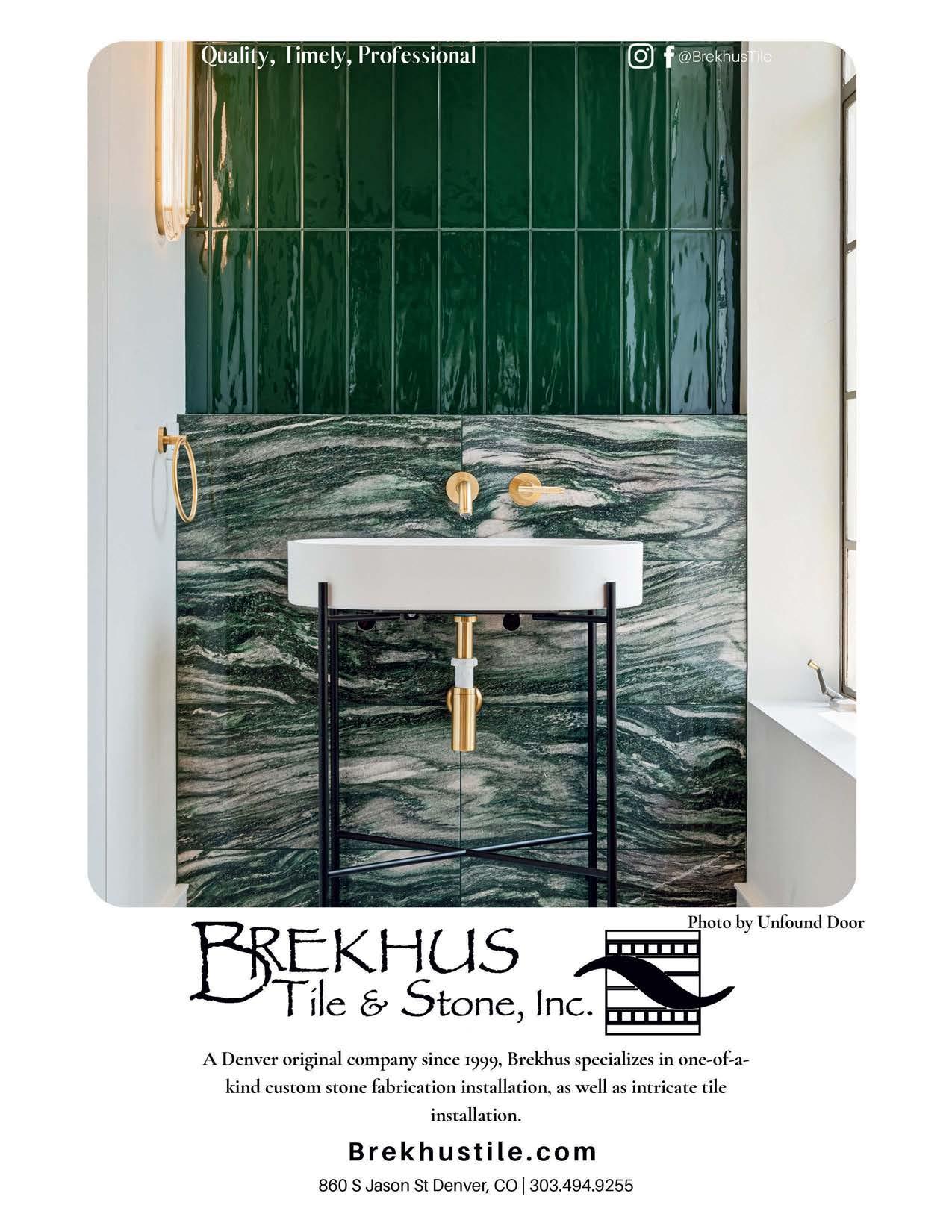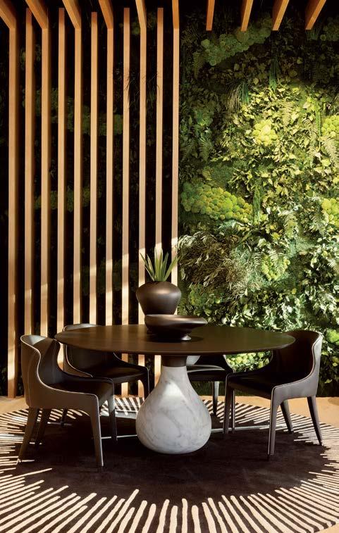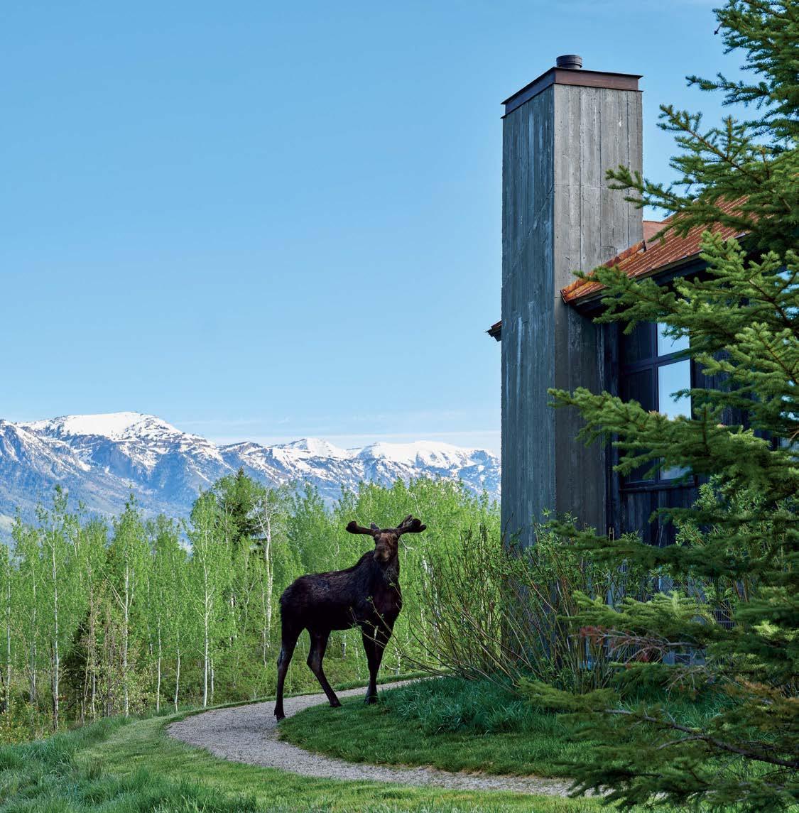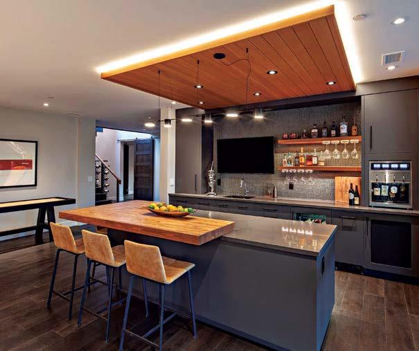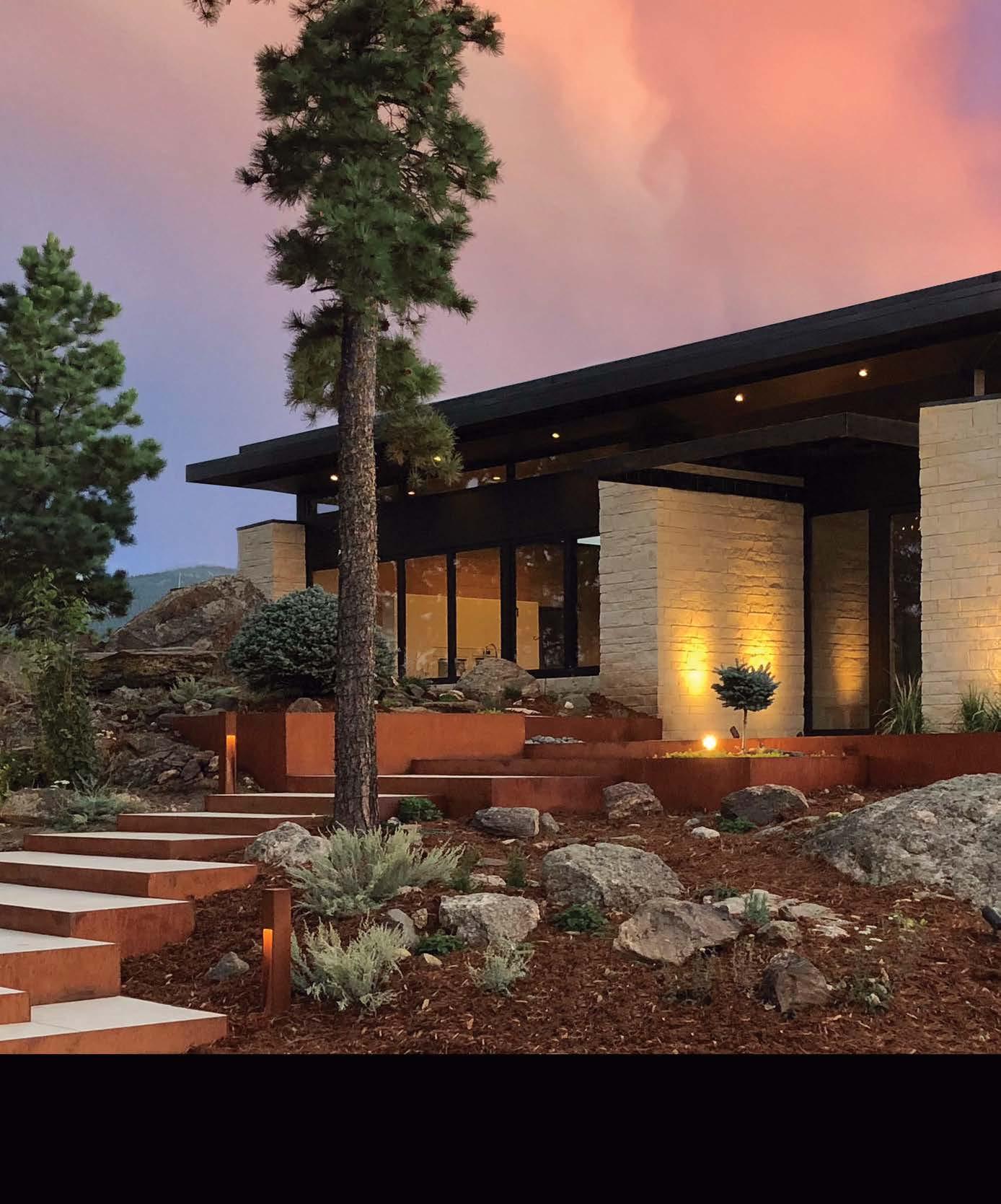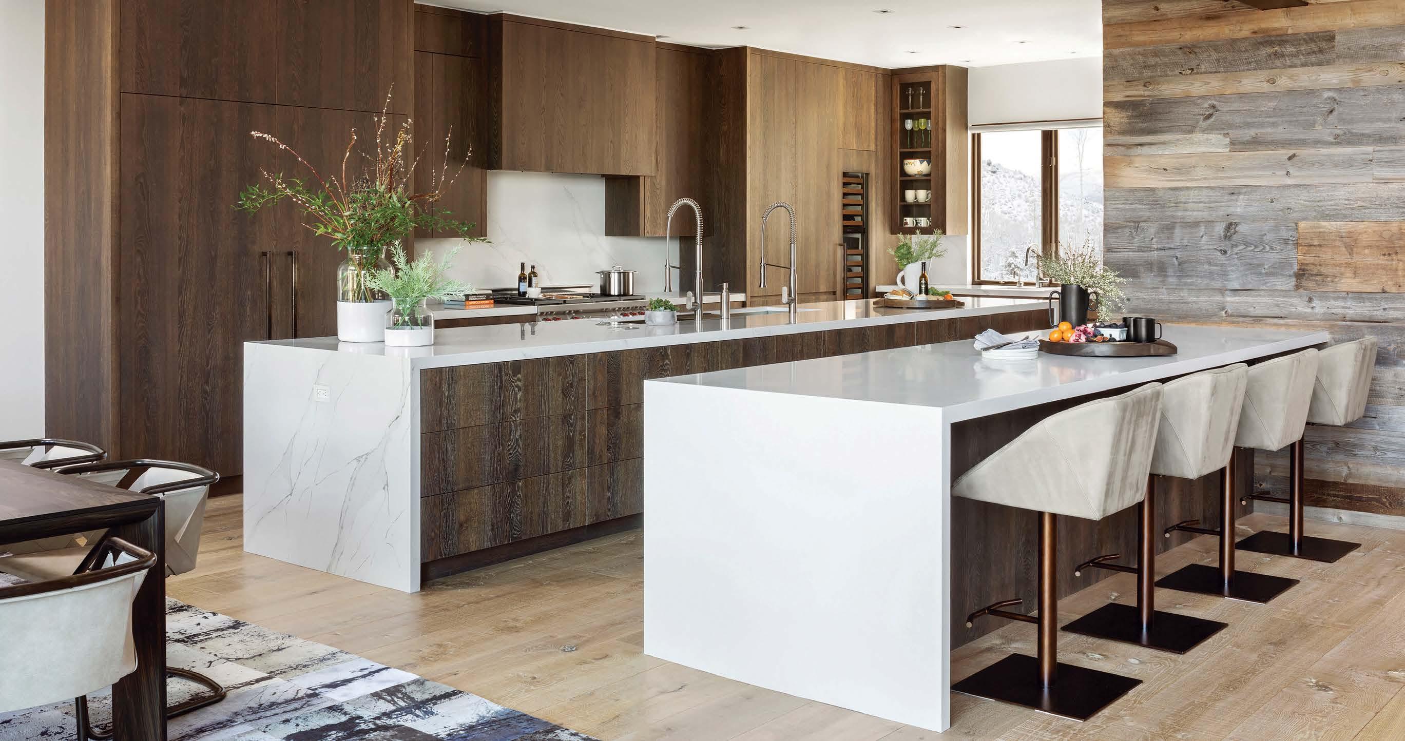 ON THE COVER: Rowland+Broughton paired a wall of Black Cardoso granite with a grid-patterned white oak ceiling to create a living area rich with contrast in a renovated Aspen home. Two Tacchini tables topped with Sahara Noir marble layer in more visual interest. The chair is RH and the rug is Rosemary Hallgarten. Page 170