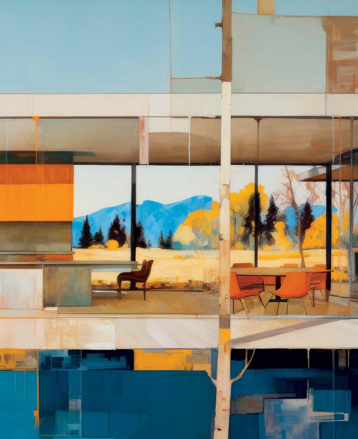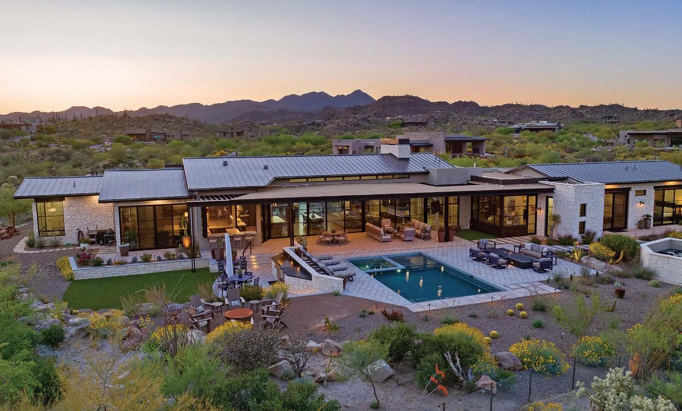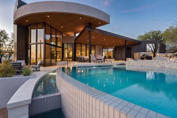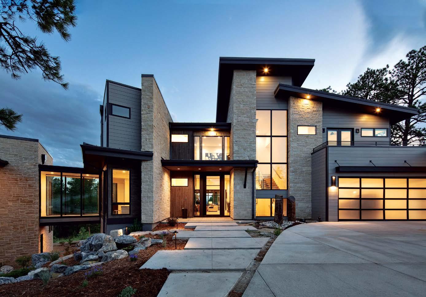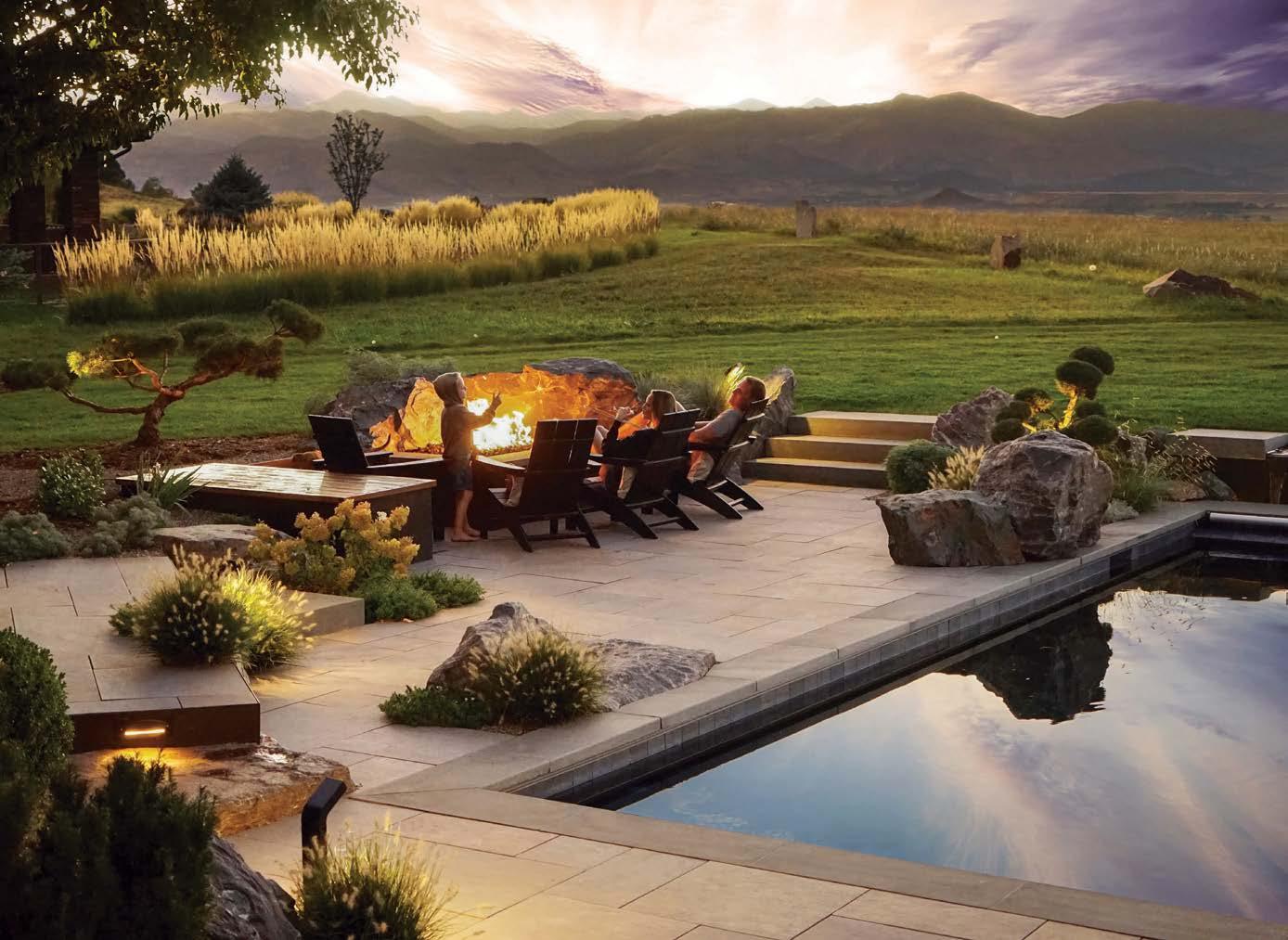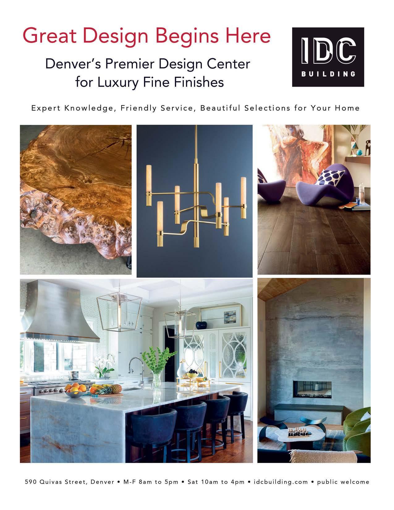 ON THE COVER: Rowland+Broughton paired a wall of Black Cardoso granite with a grid-patterned white oak ceiling to create a living area rich with contrast in a renovated Aspen home. Two Tacchini tables topped with Sahara Noir marble layer in more visual interest. The chair is RH and the rug is Rosemary Hallgarten. Page 170