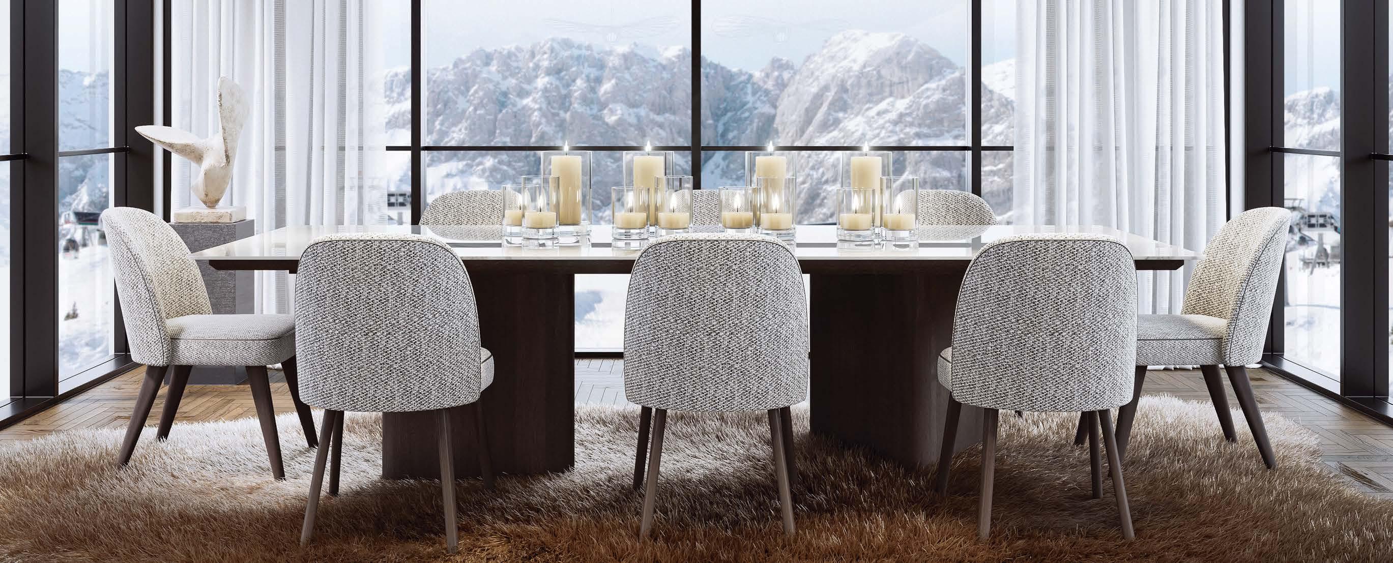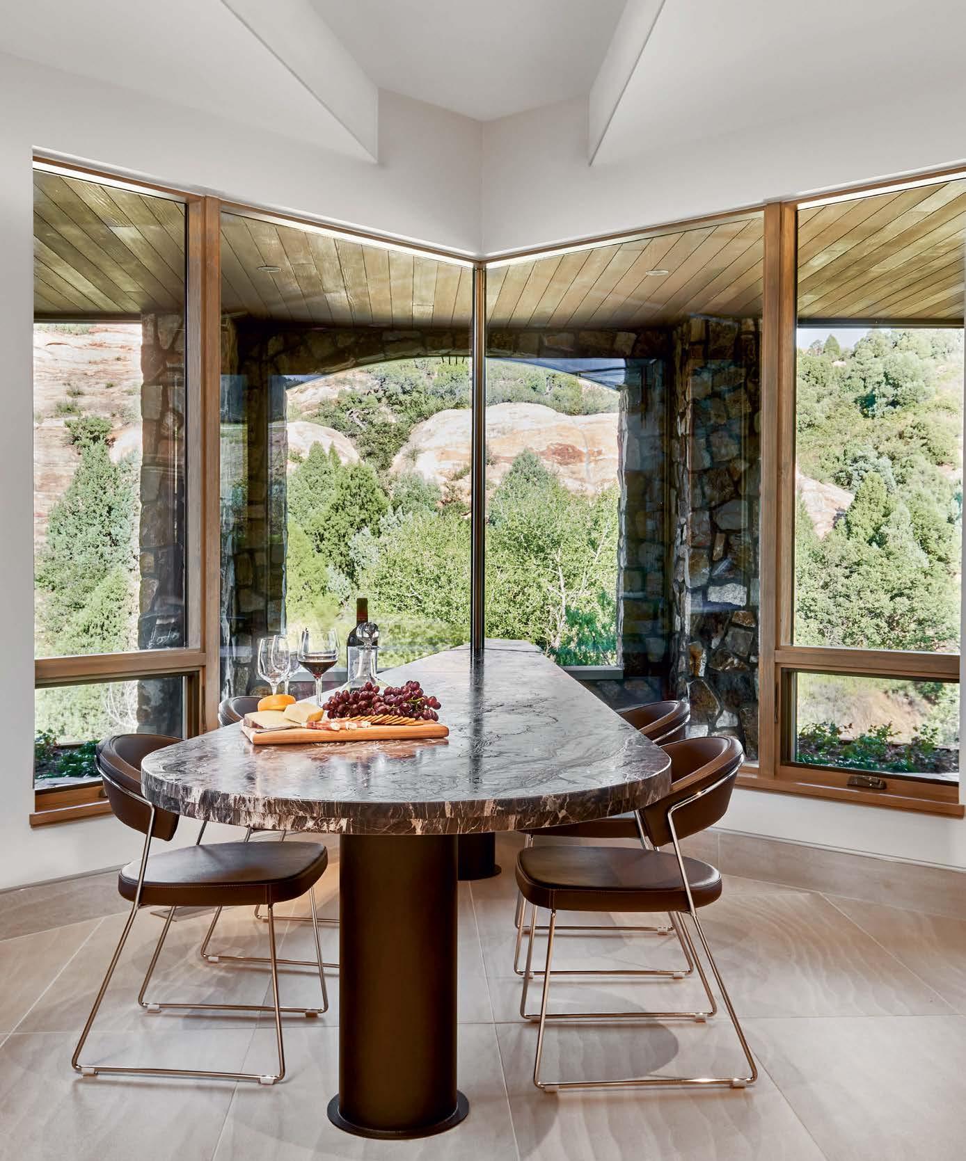 The living room, which opens to a terrace, is centrally placed, with the dining room doubling as a passageway framed with windows that leads into the kitchen. Branching off the other side of the living room, a study detailed with similarly facing windows serves as a connection into the owners’ suite. “Modern elements allow this house to breathe,” notes Ruard of the scaled-up use of glass that invites in the woody surroundings from nearly every space. The lower level holds guest rooms, a gaming area and a separate ski entry and lounge space, neatly allowing privacy for visitors and keeping sporting equipment separated.