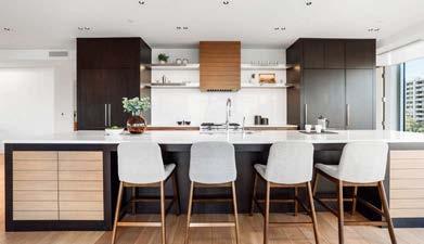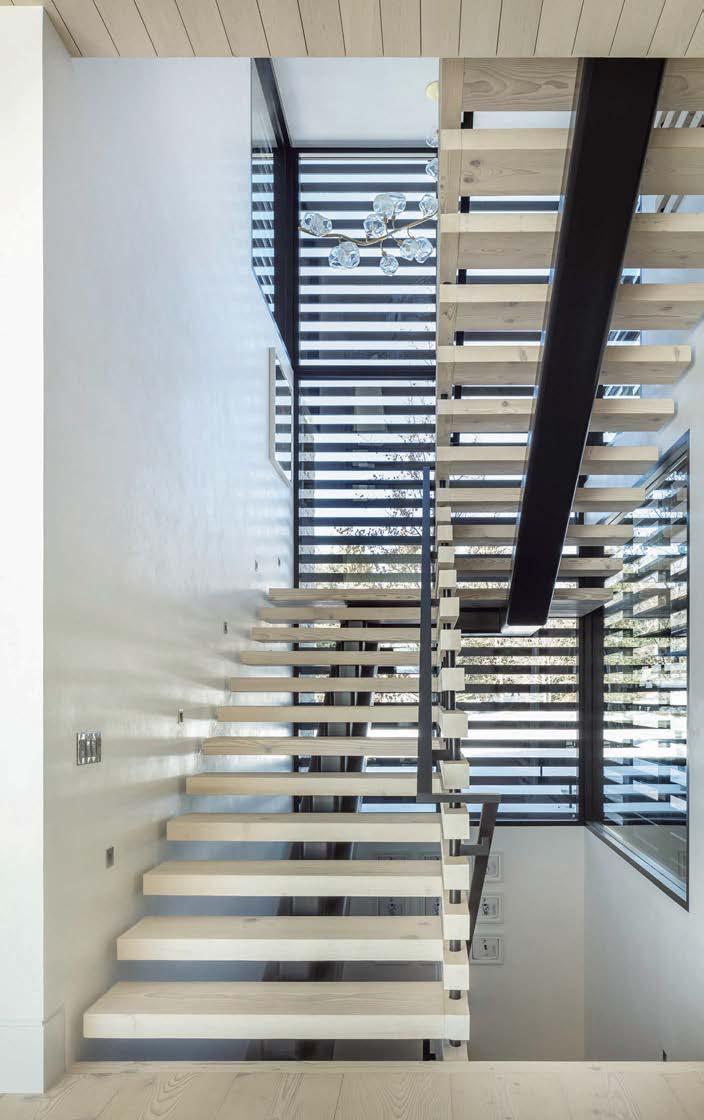 to create a cohesive dwelling. Beazley developed a layout that elevates the main living spaces to the second floor, capitalizing on the stunning views, with the sons’ bedrooms and a family room below. A spacious primary suite imagined as an in-home retreat for the owners is also on the top level. In close collaboration with Robison and Wheeler, the architect specified a palette of white oak, cedar and hemlock, used throughout the home, as well as a recurring slatted wood motif—a detail derived from Japanese privacy screens. Trellis-like shading on the deck off the living area is a twist on this idea, too. Black steel accents emphasize the extended eaves of the roof and play up the architecture’s clean lines while the use of lighter wood tones ties into Japandi style. And stone cladding grounds the home and helps it fit into the natural environment. Tiers of built-in garden beds that landscape architect Amy Barrow filled with native greenery enhance the effect.