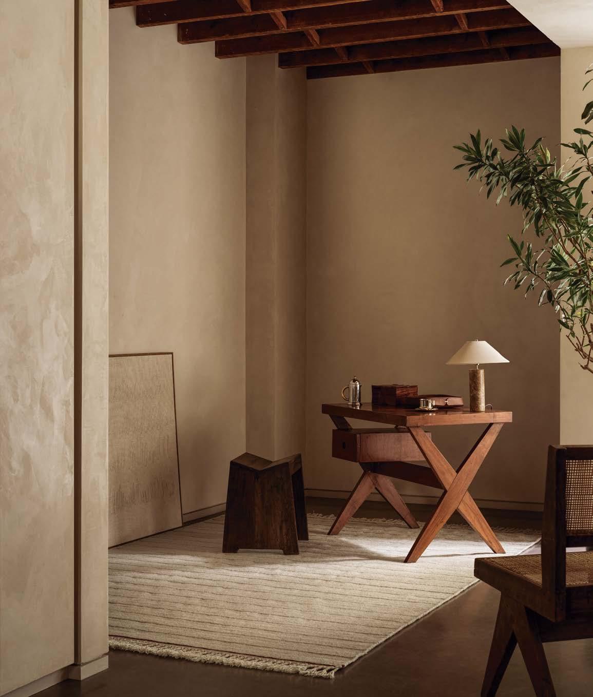 living room, a fieldstone-clad central fireplace and carved stone panels found at the Paris Flea Market bring natural texture into the space. The low cabinet and chair are both Liagre. The pendant is Ochre.