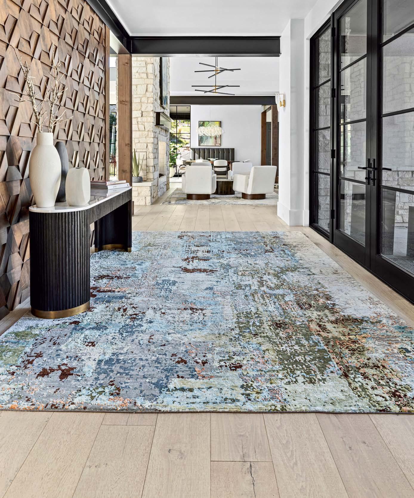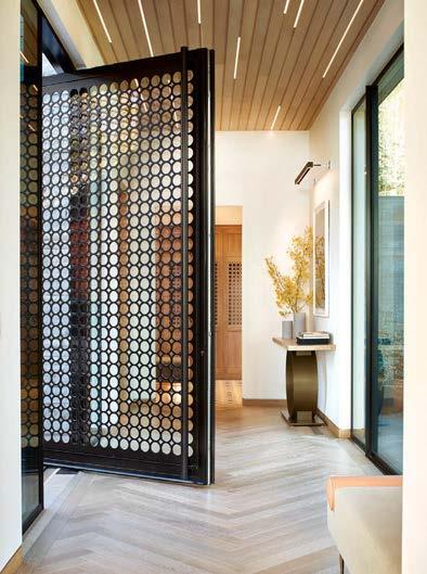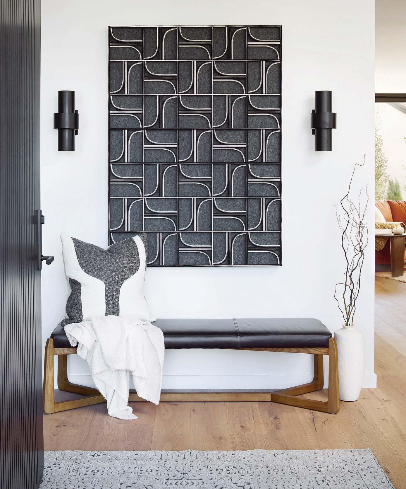 Previous page, right: A custom oak pivot door with an Emtek pull draws guests into the entry hall, where a Nordic Knots rug rests beside a Clubcu console of reclaimed elm. The metal vase is from Arhaus.