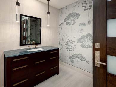This sophisticated bath boasts an exotic Azul Del Mar quartzite mosaic countertop from Stone Traditions, Inc., Phillip Jeffries 6104 Bright Side wallpaper on spring linen and a TruStile walnut door in an ebony hand-wiped finish from Mountain View Window & Door. 303.229.4130 | oneresidentialbuilders.com