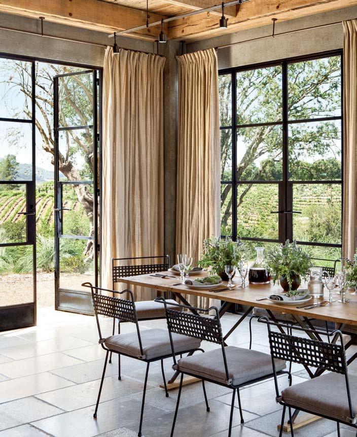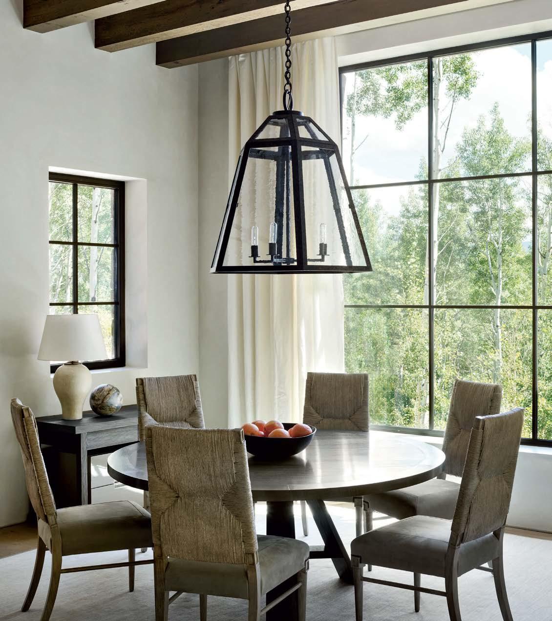 Opposite: A Gregorius Pineo hand-forged lantern, round oak table and woven-back side chairs all come together in the breakfast room. The neutral-hued Stark rug complements Saladino for Savel linen curtains and walls of Benjamin Moore’s White Dove.