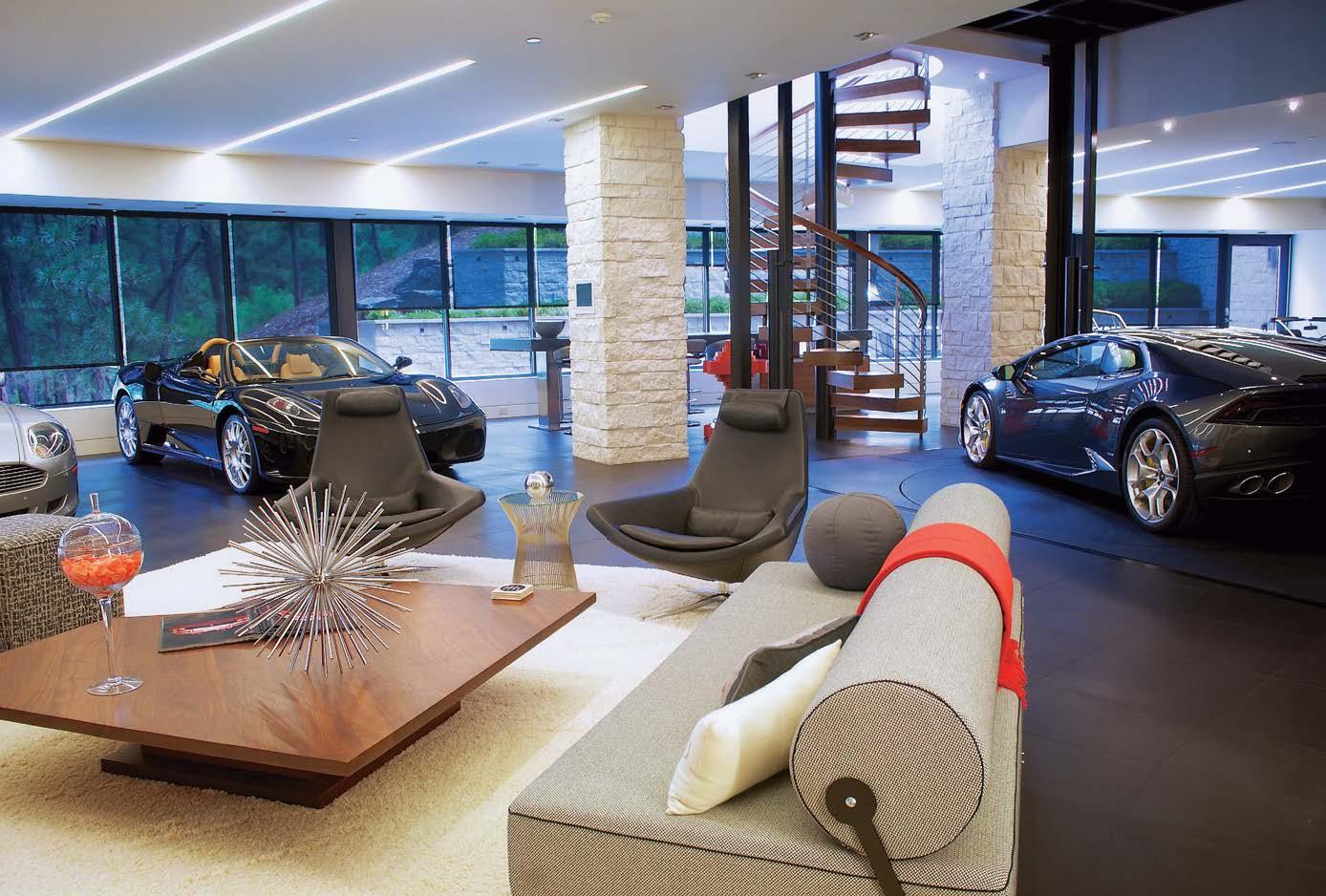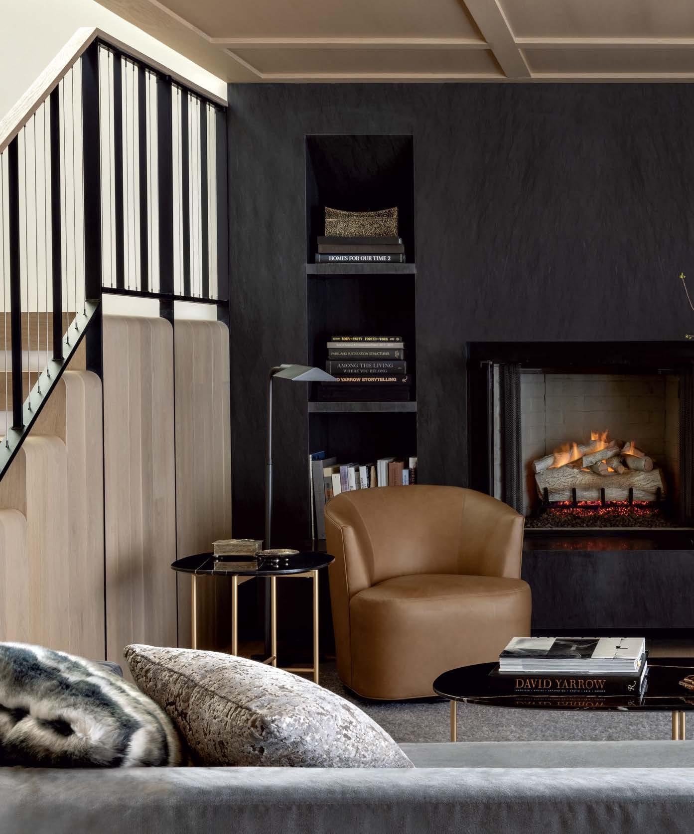 Previous page: Black Cardoso granite extends across the living area’s fireplace wall, setting off the white oak ceiling and a custom staircase by WoodHaven United, Inc. A Rosemary Hallgarten rug unites RH chairs and two Tacchini tables topped with Sahara Noir marble.