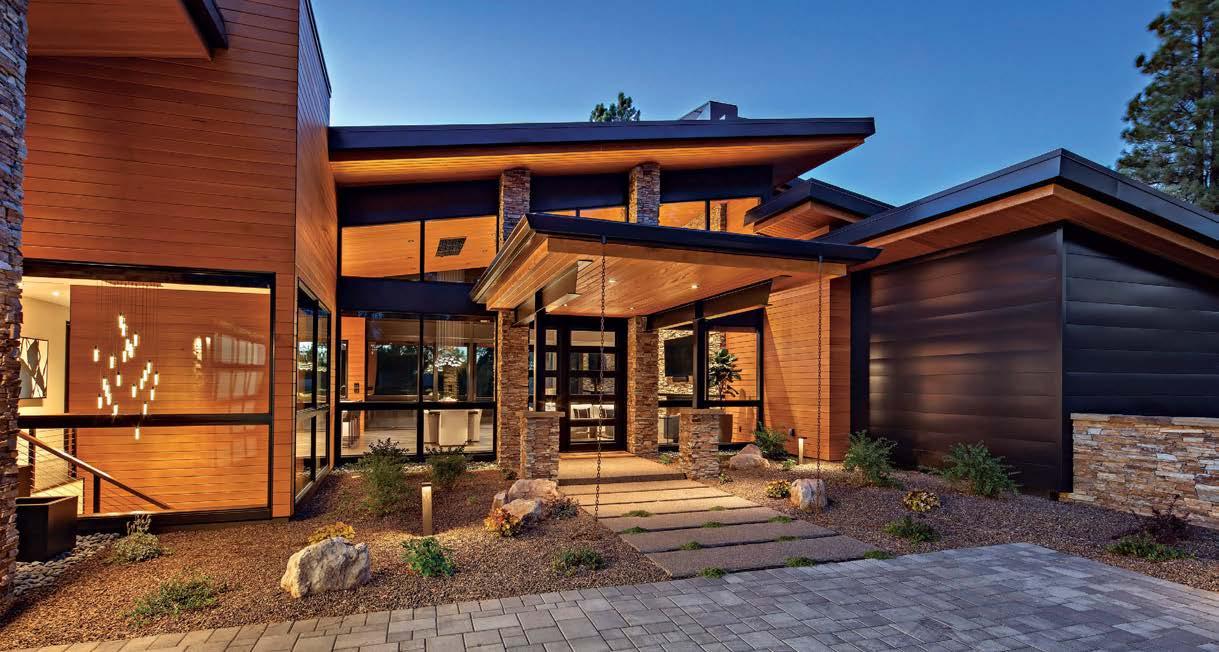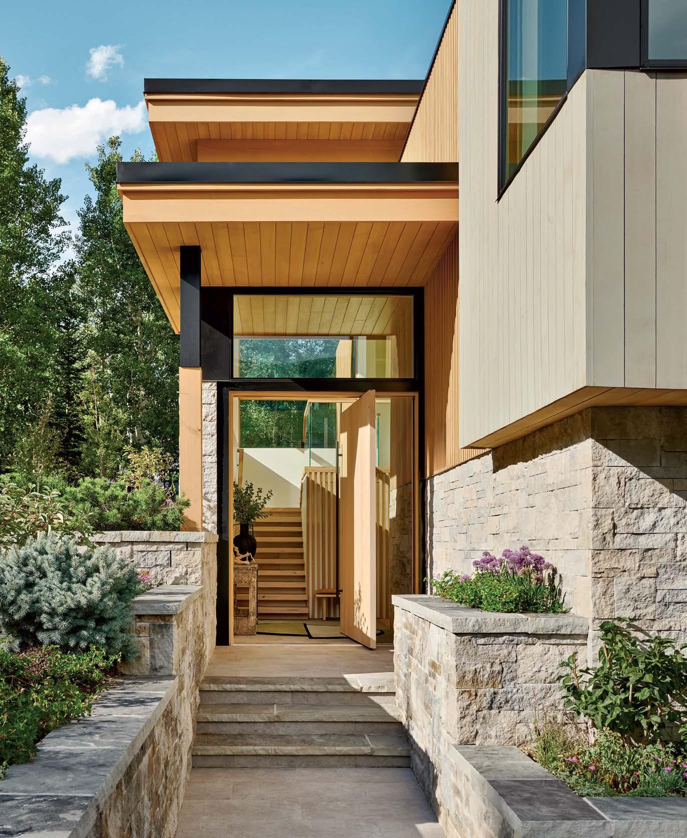 Textured fieldstone and limestone, Douglas fir and white oak are all featured on the front façade.