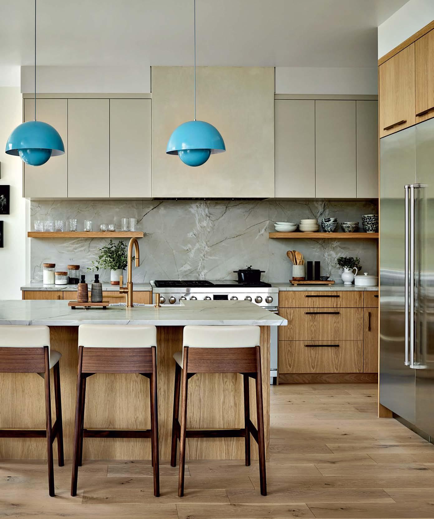 Verner Panton for &Tradition pendants hang above the kitchen island flanked by Design Within Reach stools. A Studio Bertjan