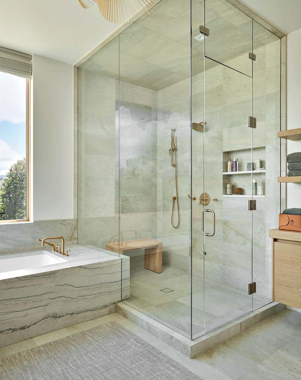 Above: White Macaubas quartzite lines the tub, which neatly interlocks with the primary bathroom shower. The faucet is California Faucets and porcelain tile from Decorative Material envelops the shower walls and floor. The wool rug is Annie Selke and the teak bench is from Pottery Barn.