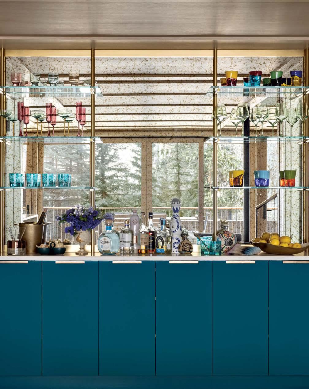 Above: The bar features an antique-mirror backsplash and glass shelving with bronze accents. The lacquered cabinetry is color-matched to Benjamin Moore’s Naples Blue, with Sun Valley Bronze hardware.