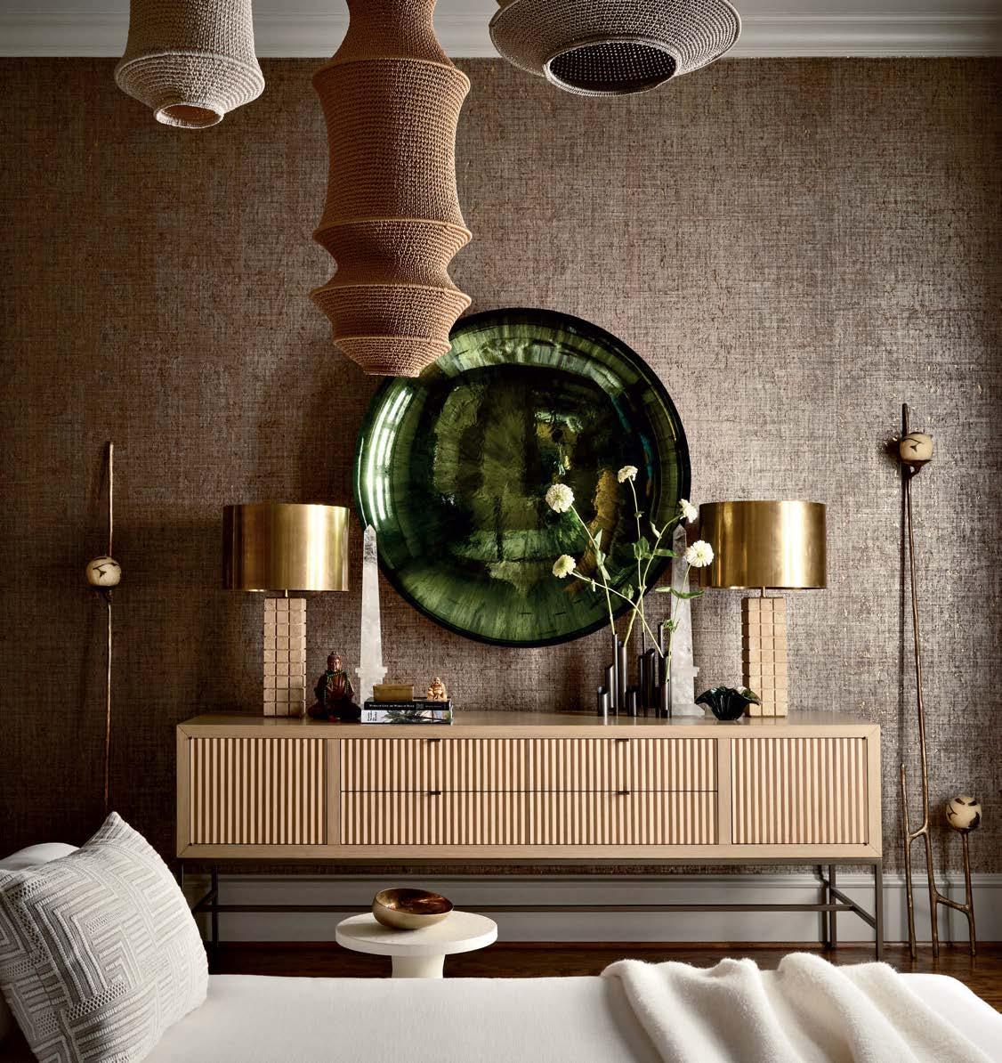 Comfort and beauty were the cornerstones of Kasler’s cohesive furnishing plan as well. She sought out inviting pieces that leaned contemporary but were also replete with details that read as art, not unlike pieces of high fashion. See the contrasting band of natural wood that flows across a low cabinet in the living room, or a nearby chair’s leather-wrapped arms—“the kind of design moment you might find on a Hermès handbag,” describes the interior designer. And the room’s wall art is a series of stone panels etched with a metallic wash and hung with brackets, their weightiness creating a connection to the architecture. “They’re perfect for this house and so, so chic,” Kasler enthuses.