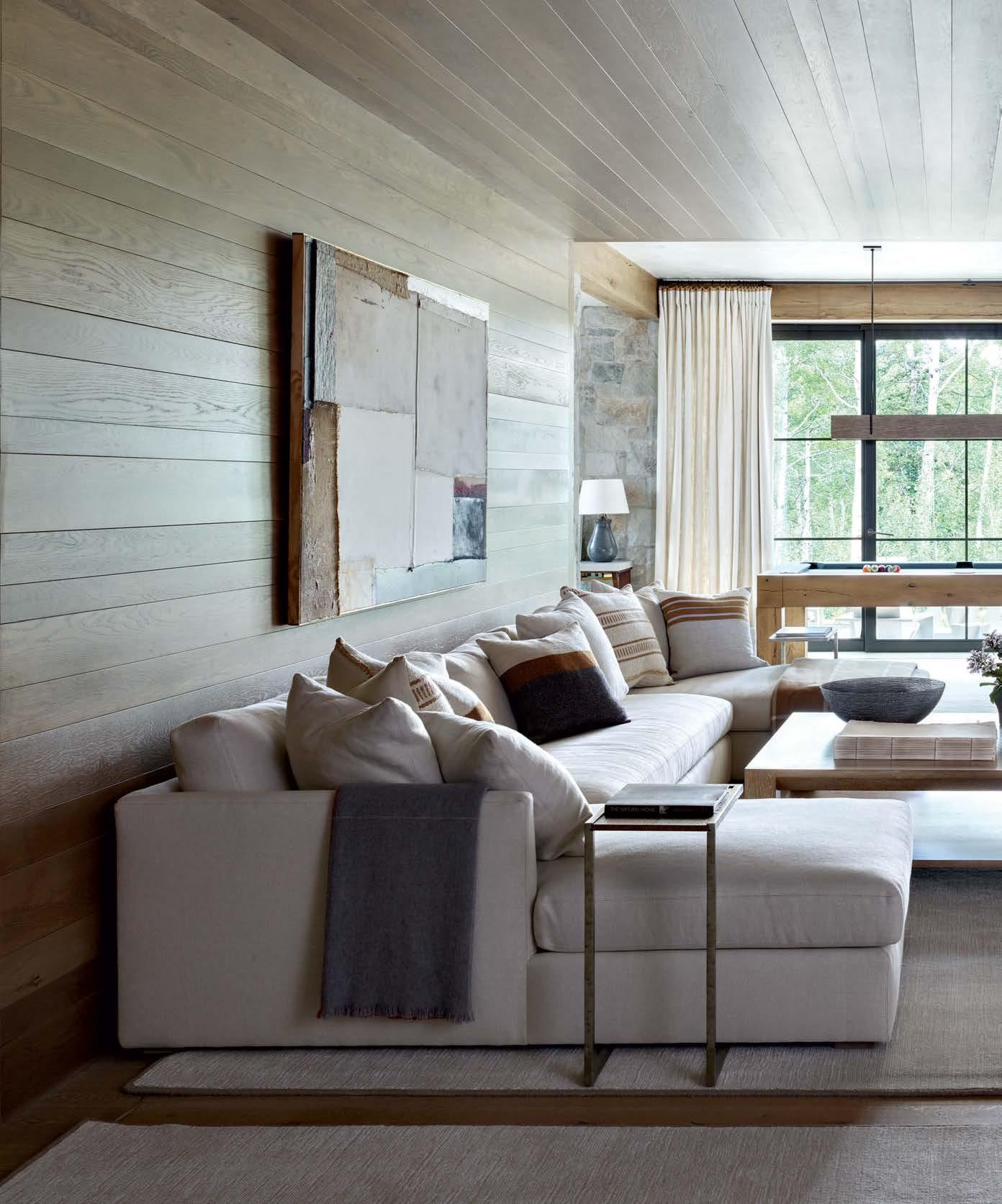 Rift-sawn white oak planks encase the family room, where a Verellen sectional, Ernest Gaspard coffee table, C.J. Peters credenza and vintage chairs create a comfortable tableau. The billiard table is RH and the rug is by Stark. Manolis Tzortzakis art adorns the wall.