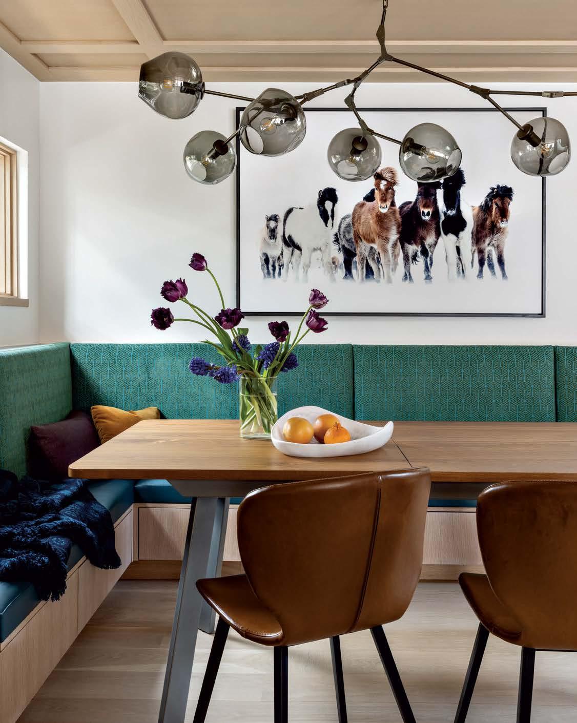 Opposite: Lindsey Adelman Studio’s Branching Bubble chandelier floats above the dining table and a bespoke banquette upholstered in Edelman leather and a geometric Cosmati chenille from Schumacher. The artwork is by Guadalupe Laiz.