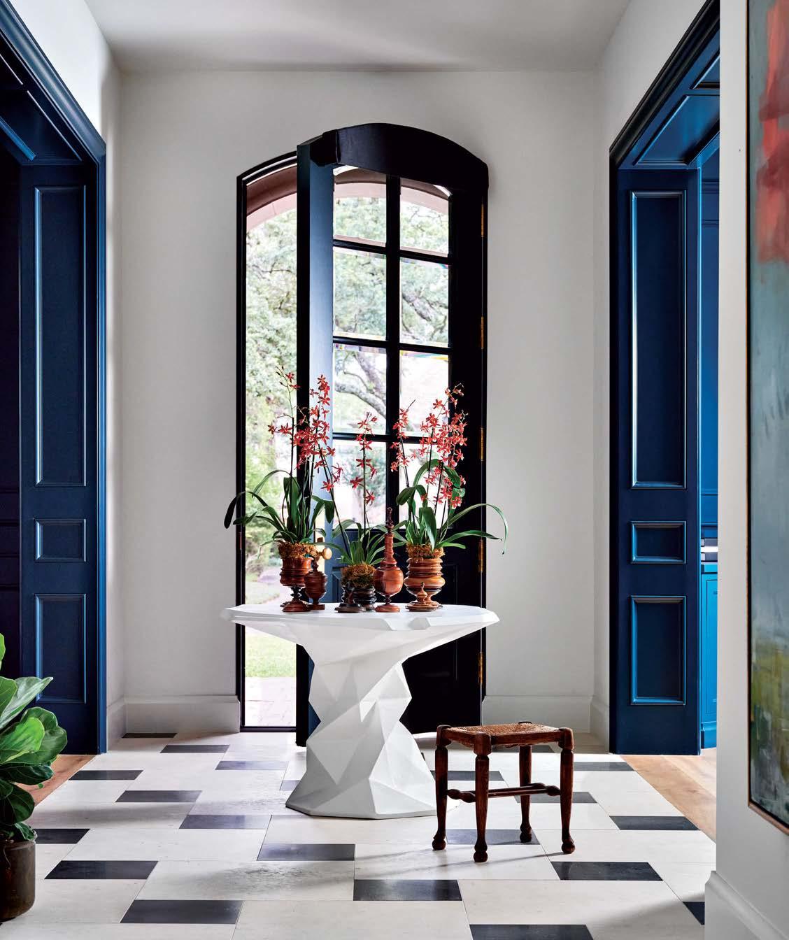 The entry’s existing limestone and basalt floor tiles set the tone for this home’s eclectic interiors. Stephen Antonson’s Macklin center table from Wells Abbott is topped with the homeowner’s collection of antique English tobacco jars.