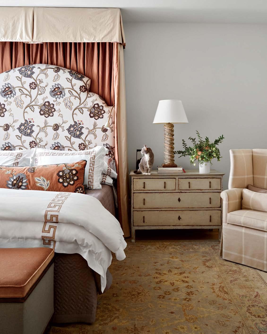 Opposite: The primary bedroom’s headboard dons Lee Jofa’s Floral Fantasy print, complementing Schumacher bed curtains and a Leontine Linens duvet. An antique chest from W. Gardner, Ltd. and chair from Ferrell Mittman rest on a Tabriz floor covering from Matt Camron Rugs & Tapestries.