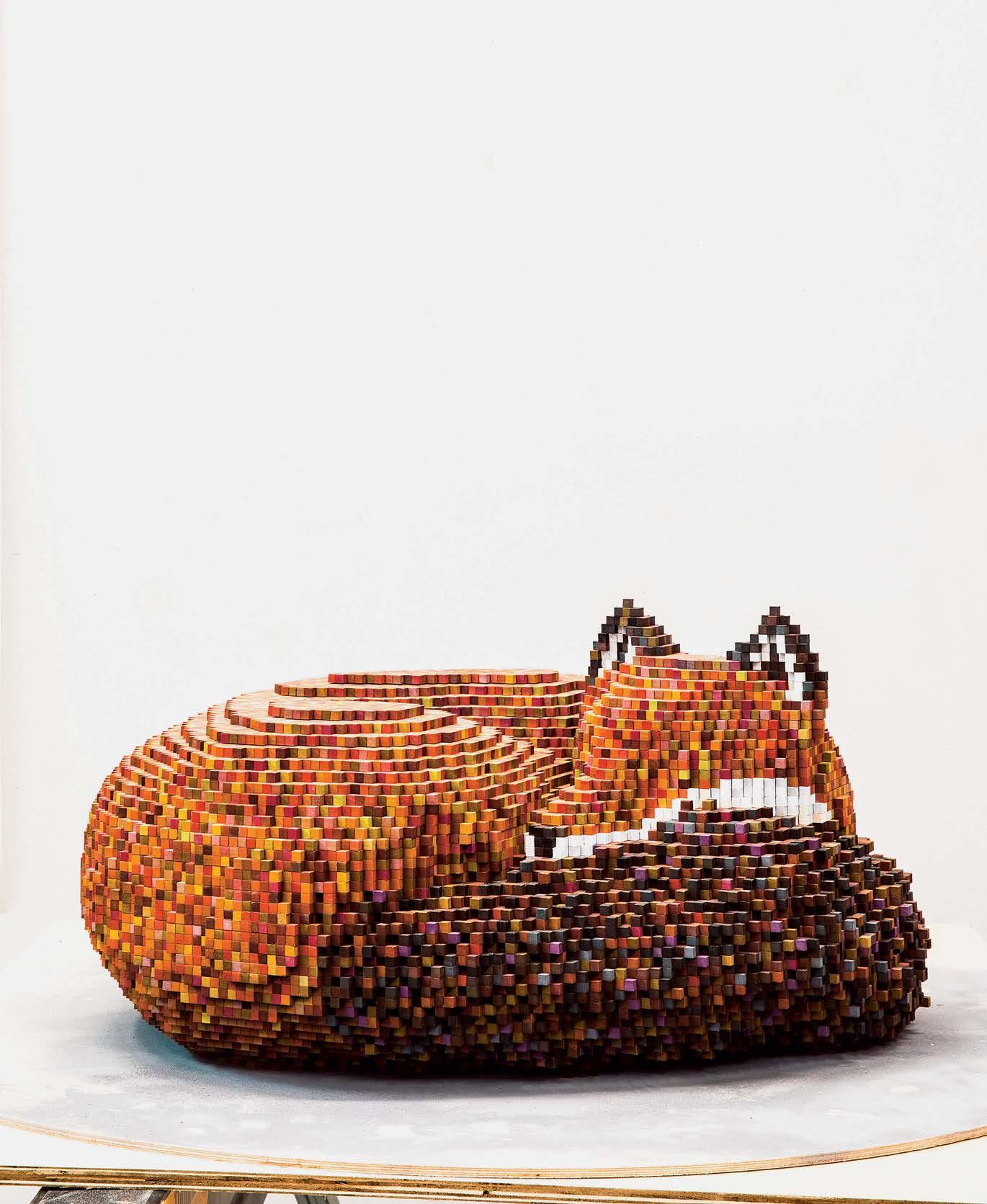 Austin artist Shawn Smith’s multimedia work explores the natural world, including an anatomical human heart comprising steel rings welded together (bottom, left) as well as Spore (left) created from arrayed 3D scans. His famous pixelated animal sculptures include a sleeping fox (previous page, left) and chimpanzee (opposite) made using pieces of colored medium-density fiberboard.