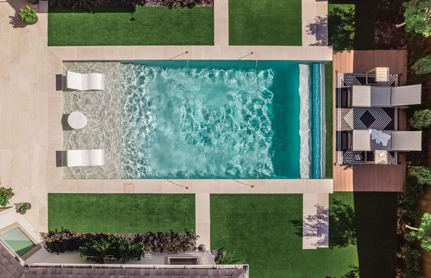 Creating high-tech, feature-fueled pools stands out among Pure Design Group’s many specialties. Hauk enthuses about a popular new possibility: “The big trend right now is acrylic glass on swimming pools to create a transparent window/wall—showcased in a plethora of ways. As an example, imagine a waterfall trickling over a crystal-clear wall and splashing into a bed of rocks while friends look on from a seating area to the action happening under the water. Your favorite Spotify playlist pumps through outdoor speakers and drives a light show within the pool. Think of it like a real-life movie.”