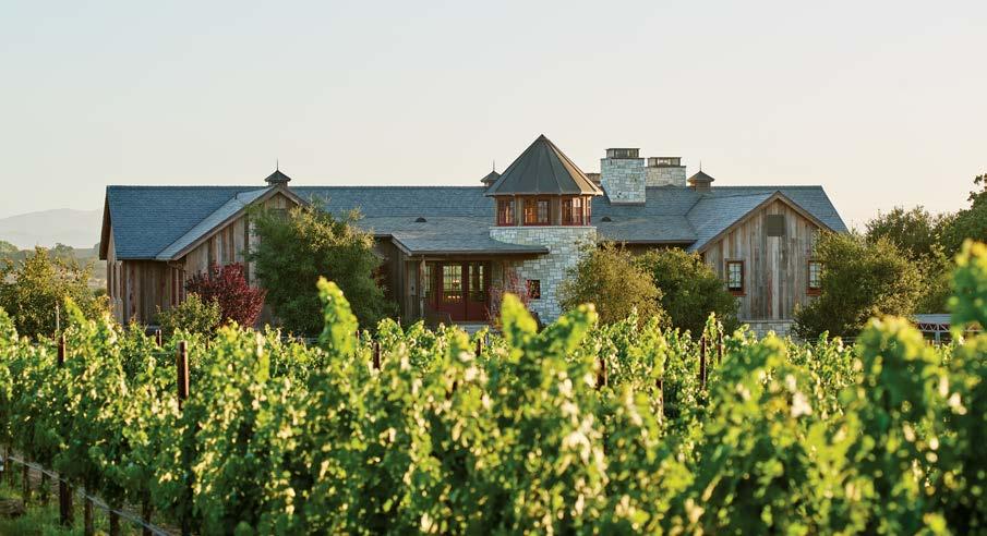 Right: Clad in Neolith’s Calacatta Gold marble, the primary bathroom features glass accents complementing the stone’s grayand-honey veining. A concrete tub from Native Trails lends an organic touch and the flooring is from Mission Tile West.