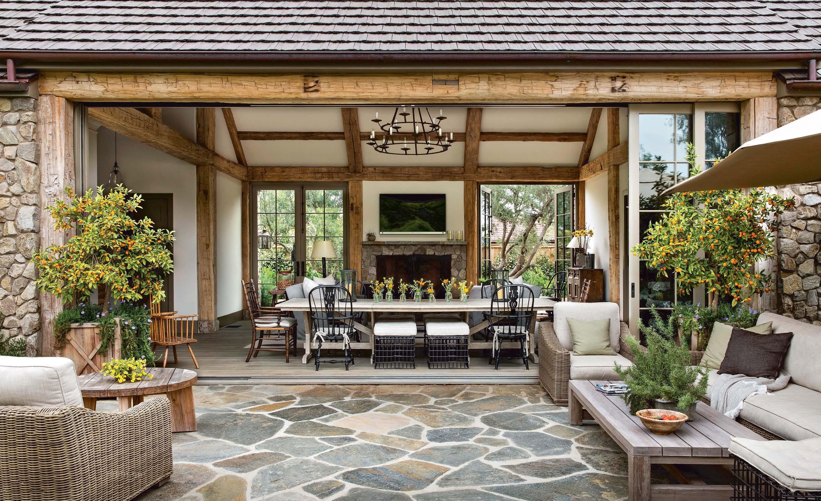 A wall of fully retractable pocket doors connects the great room to expansive exteriors and balances out the home’s traditional architecture. Reclaimed-brick flooring delineates a dining area outfitted with an RH aged-teak dining table and woven chairs from Frontgate.