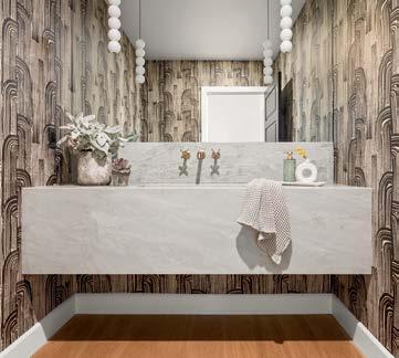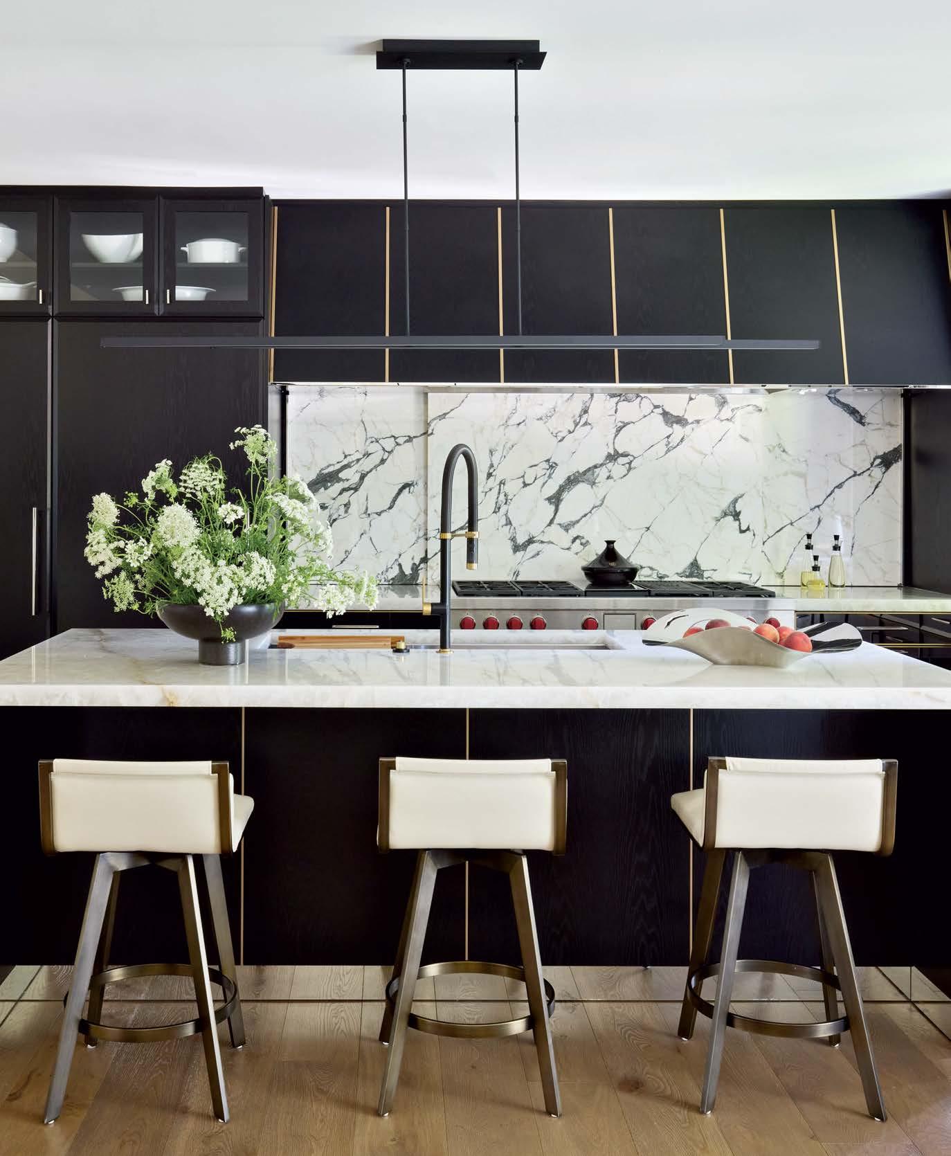 Upstairs, Jacobi put a considerable stamp on the primary suite, reconfiguring the bathroom to carve out his-and-hers amenities (including walk-in glass showers and a double vanity) and placing a striking bathtub surround of blackand-white porcelain tile as the room’s undisputed showpiece. “I had this vision of a dark moody bathroom, kind of sexy—and I knew it was going to be dramatic,” she says. The designer also repurposed one of the home’s six bedrooms into a dressing room and dream closet.