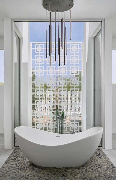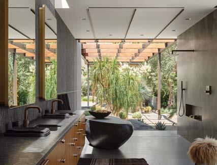 Wellness tenets also factor into the interiors, not only from a feng shui purview, but because Jensen is passionate about incorporating toxinfree finishes and natural, sustainable materials whenever she can. Some of the interior stonework, for instance, is repurposed from broken tiles that would have otherwise been discarded. Given a textured finish, it brings in a sense of wabi-sabi that appealed to the designer. Smaller tweaks, like softening the lighting in the owners’ suite, allow the space to also function as a recuperative sanctuary when necessary. “There were a lot of conscious moves like this throughout that picked up on the idea of holistic healing,” notes the designer, concluding, “The goal was that the house would feel effortless, like you could leave your baggage at the door and just breathe.”